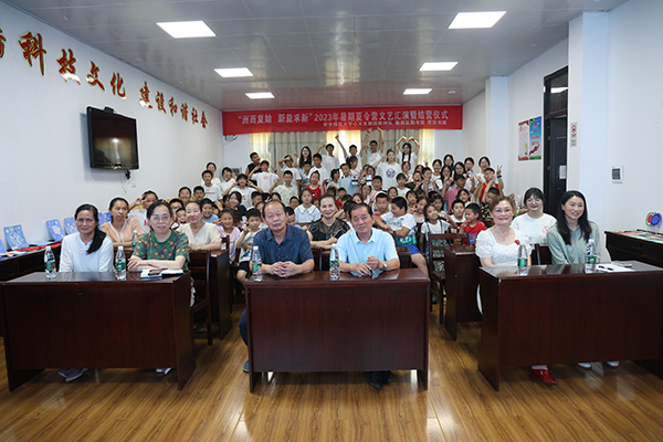 华大青年讯(通讯员 杜玉宇 罗佳雨 赵雯)为给学生提供展现才艺的舞台,检验本次夏令营的实践成果,7月27日上午,华中师范大学心火支教团新洲队(以下简称“新洲队”)在新洲区图书馆举行了文艺汇演暨结营仪式。新洲区教育公益服务小组代表戴国华,新洲区教育局阅读推广服务中心主任刘晓琳,新洲区邾城街向东小学副校长周启发,新洲区图书馆支部书记、馆长童小玉,新洲区图书馆副馆长刘水英,新洲区图书馆阅读推广部主任陈慧敏出席此次活动,周欣书城工作人员、新洲队全体队员及学生参与此次活动。