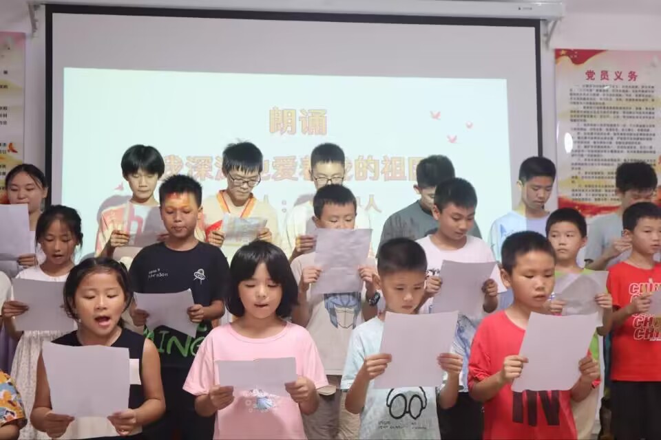 在金龙村,志愿者老师李坤阳用一首《海阔天空》拉开了文艺汇演的序幕。同学们带来了丰富多彩的表演,金龙村全体同学齐声朗诵,高声合唱《我深深地爱着我的祖国》《我和我的祖国》,气势磅礴;《小城夏天》《孤勇者》《向云端》,孩子们用歌声展示了21天学习的成果;师生合唱《起风了》将现场的气氛推向高潮。最后,金龙村全体志愿者老师们合唱《再见》,用歌声与同学们道别,表达了对金龙村全体领导、同学的祝福和感谢。