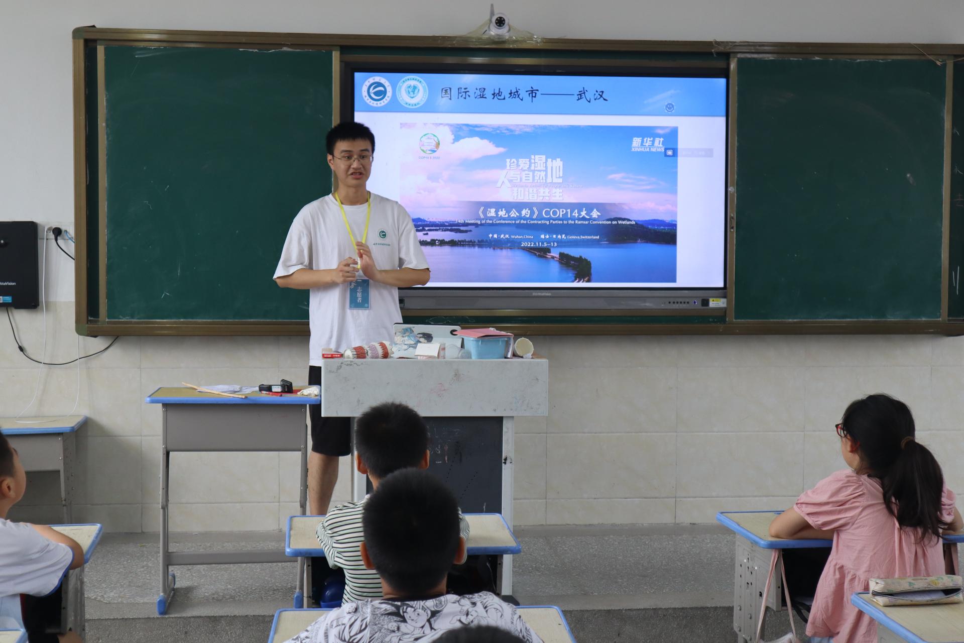 服务队队员在十堰市丹江口市习家店小学开展“美丽的河流与湖泊”主题课程。本主题课程以《武汉:湿地之城》宣传视频为引入,引导学生辨认并分析湖泊河流、介绍分享自己与河湖故事。随后,志愿者以简易河流地形模型为教具,演示河湖形成过程,并引导学生结合自身生活经验和地理位置特点,归纳总结河湖各类功能,意识到共同呵护河湖环境的重要性。