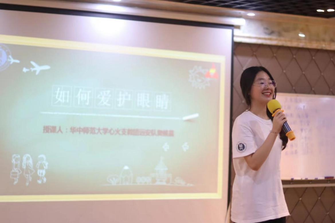 华大青年讯(通讯员 樊候晨 杨钰灿)为培养学生爱眼护眼的良好习惯,7月31日,华中师范大学外国语学院心火支教团远安队(以下简称“远安队”)广宜服饰分队在湖北省宜昌市远安县广宜服饰分点开设了以“守护‘睛’彩,点亮‘视’界”为主题的特色课程。该课程由广宜服饰分队队员樊候晨主讲。