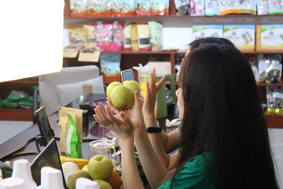 宣恩县内多为山区,昼夜温差较大,土壤富含硒元素,有利于黄金梨糖分的积累。这里的黄金梨皮薄肉厚,香脆解渴,一直深受当地人的喜爱。8月,正是这片土地黄金梨丰收的季节。为帮助黄金梨走出宣恩,让更多人品尝到宣恩黄金梨的美味,电商助农实践队采用“直播+加工”的新模式,将直播场地划分为直播区与加工区,以作为黄金梨拣选与包装场地的加工区为直播背景,帮助观众更真实透明地观看到黄金梨的加工过程,收获了良好的直播效果。观众们不仅可以领略黄金梨的特点与魅力,更能感受到现场加工工作的真实与热闹氛围。