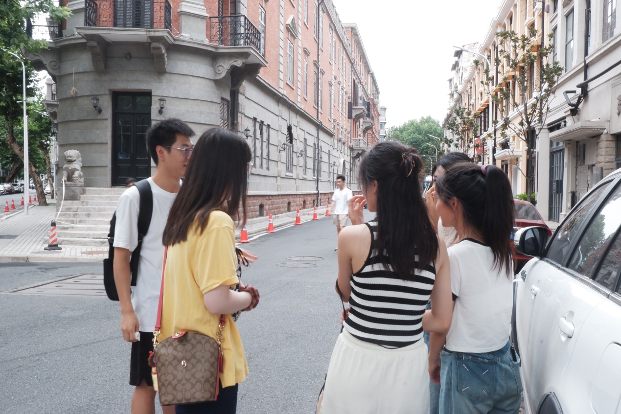 实践队队员针对游客进行了调研问卷的分发以及访谈,其中成员张世甲首先对在巴公房子旧址前打卡拍摄的三名女大学生进行了访谈。三名女生告诉团队成员,她们是外地游客,在暑假期间趁机来到武汉旅游,当被询问到“为何选择黎黄陂路作为游览打卡点”时,三位女大学生表示小红书、抖音APP等作为“大学生特种兵式旅游”的种草平台,为她们的武汉之旅规划行程提供了借鉴,成为吸引她们前往黎黄陂路感受地域特色的重要因素。在旧址的实地游览中,游客仿佛进入了近代汉口的租界岁月。