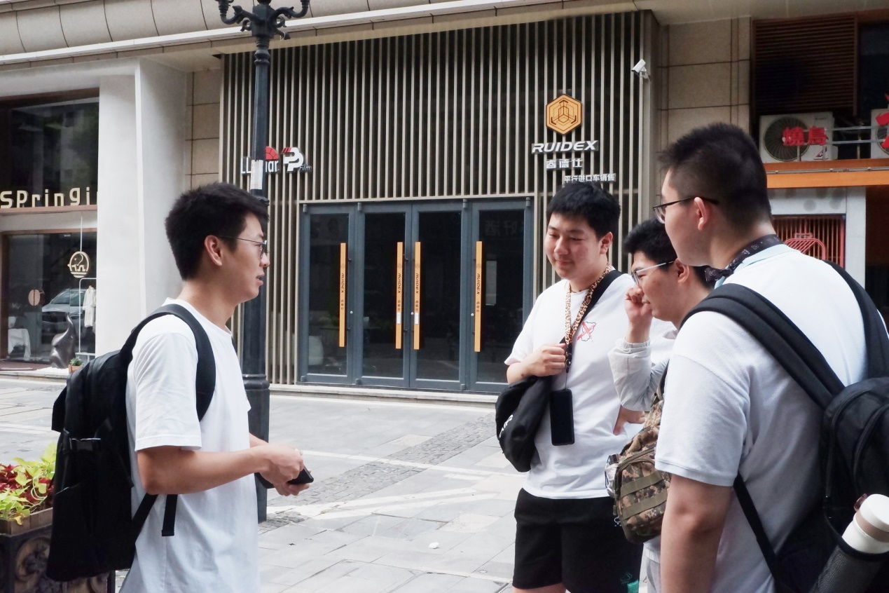 成员刘航对三名男大学生进行街访。三名大学生是2023届毕业生,武汉作为他们选择毕业旅行的地点之一。三名大学生通过自媒体了解到黎黄陂路,当被询问到“黎黄陂路最吸引你的点是哪里”时,他们表示,对街口整体的建筑风格印象最深刻,这和周围的高楼形成鲜明的对比。整个街区都体现着东方文化与西方建筑的融合,承载着历史与现代的时代信息。当问道“与你们去过的景点相比有什么明显的差异”时,他们表示,夜间经济差异巨大,就拿和江汉路步行街进行对比,晚上的江汉路灯火通明,人山人海,反观黎黄陂路人烟稀少,夜经济比较贫乏,夜间可持续性发展乏力,并表示对历史文化街区的发展,要秉持保护与利用相结合的理念,保护现有的建筑风貌为第一要务,通过政府主导、市场引导盘活黎黄陂路的夜间旅游,助力城市更新。