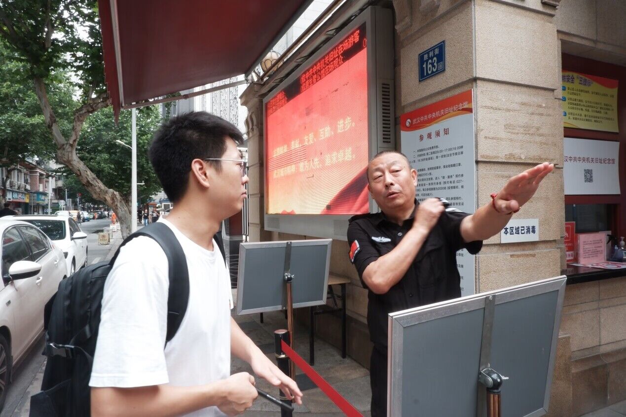 在进入场馆之前,小队成员张世甲、刘航对武汉中共中央机关旧址纪念馆的安保人员进行了访谈。从与安保人员的谈话中得知,在武汉市政府积极改造下,以颇具历史风貌的黎黄陂路为轴心的旅游街区,逐渐从无人问津的私密生活区域向网红打卡空间转变。黎黄陂路从老武汉人都知道但不会刻意进入的街区,变为民国旅拍、婚纱摄影的伊甸园。某种程度而言,游客的到来带火了以中共中央旧址为主体的红色教育基地。安保人员提到,今年端午节期间,中共中央旧址纪念馆一天接待1500人次,红色旅游占据了黎黄陂路街区文化的重要一隅。