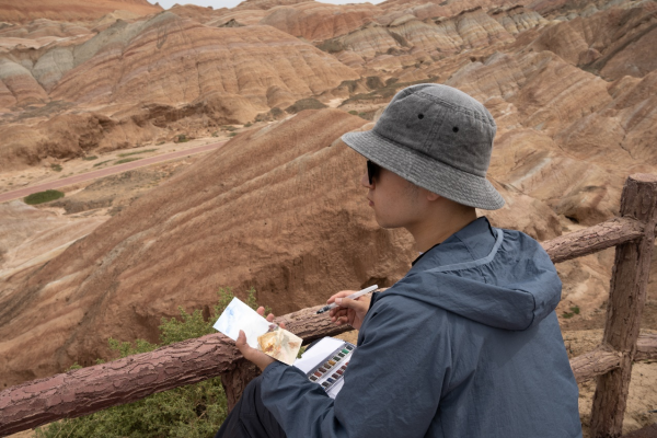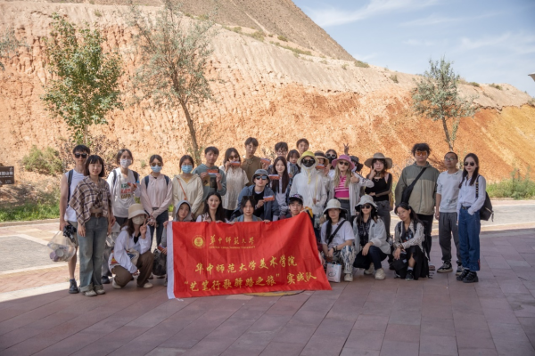 华大青年讯(通讯员 金琳)张掖市临泽县的七彩丹霞地质公园,地处甘肃北部祁连山脉脚下,被誉为中国丹霞地貌之最。诗云:“密林涛阵斜飞鸟,阔水烟波锁画阑。”丹霞地貌中薄层状泥岩、砂质泥岩及页岩错落有致,紫红色、灰绿色、黄绿色、灰黑色的土壤斑斓交织,呈现出一幅幅鬼斧神工的自然画卷。为帮助同学们开拓艺术视野,领略祖国大好河山的恢弘气势,8月26日,华中师范大学美术学院(以下简称“美院”)“艺笔行歌,驿路之旅”社会实践队成员来到这片壮美的土地,用独特的艺术之眼,感受大自然的神奇魅力。