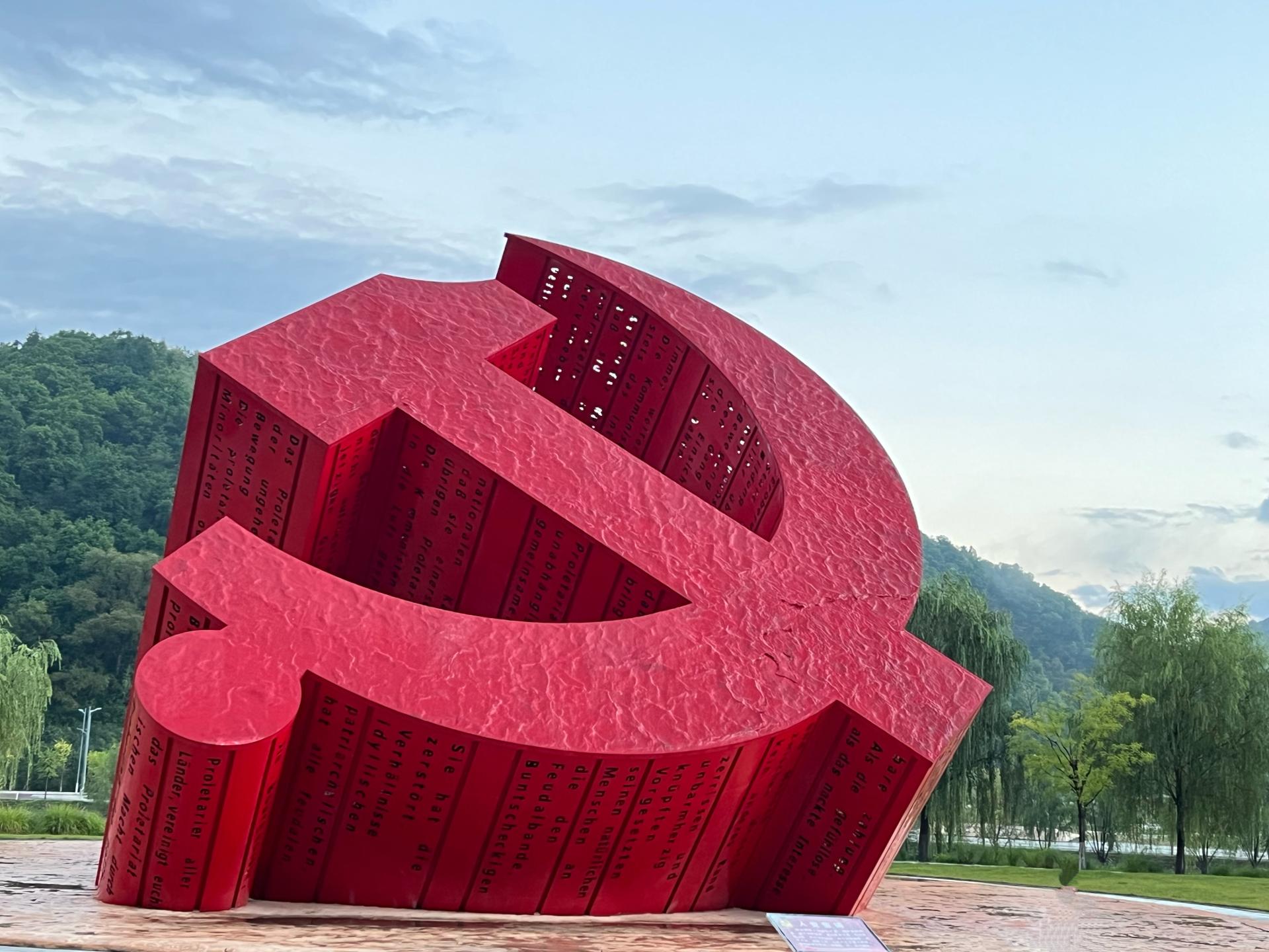随后,实践队途经南泥湾水稻田,抵达南泥湾党徽广场。青山覆盖着黄色大地,蓝天映衬着洁白流云,巨大而鲜红的党徽镶嵌在天地之间,高13.8m,其中“13”代表党中央在延安经历的13个春秋,“8”代表8年抗战;宽19m、长21m代表建党于1921年。主体造型以党徽为核心意象,通过圆雕的表现形式,对南泥湾景区的文化资源进行高度整合与创新,突出南泥湾景区的红色主题、文化主题。