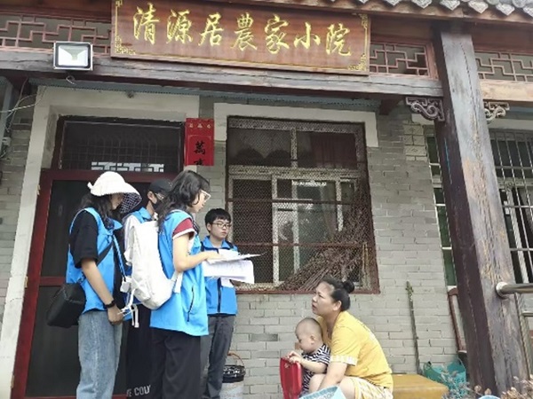 上午九点,实践队一行14人分两组走访张家冲民宿和农家乐,通过问卷调查和面对面访谈的方式了解民宿的建设、经营情况。在实地走访中,队员们发现,木兰山村民宿集中分布在张家冲下湾,绝大部分由居民自住房改建而成,并由居民自主经营。大多数经营者接受过当地统一组织的经营培训后方才挂牌营业。民宿住客来源广泛,以武汉市为主,客流量变化受旅游淡旺季影响明显。