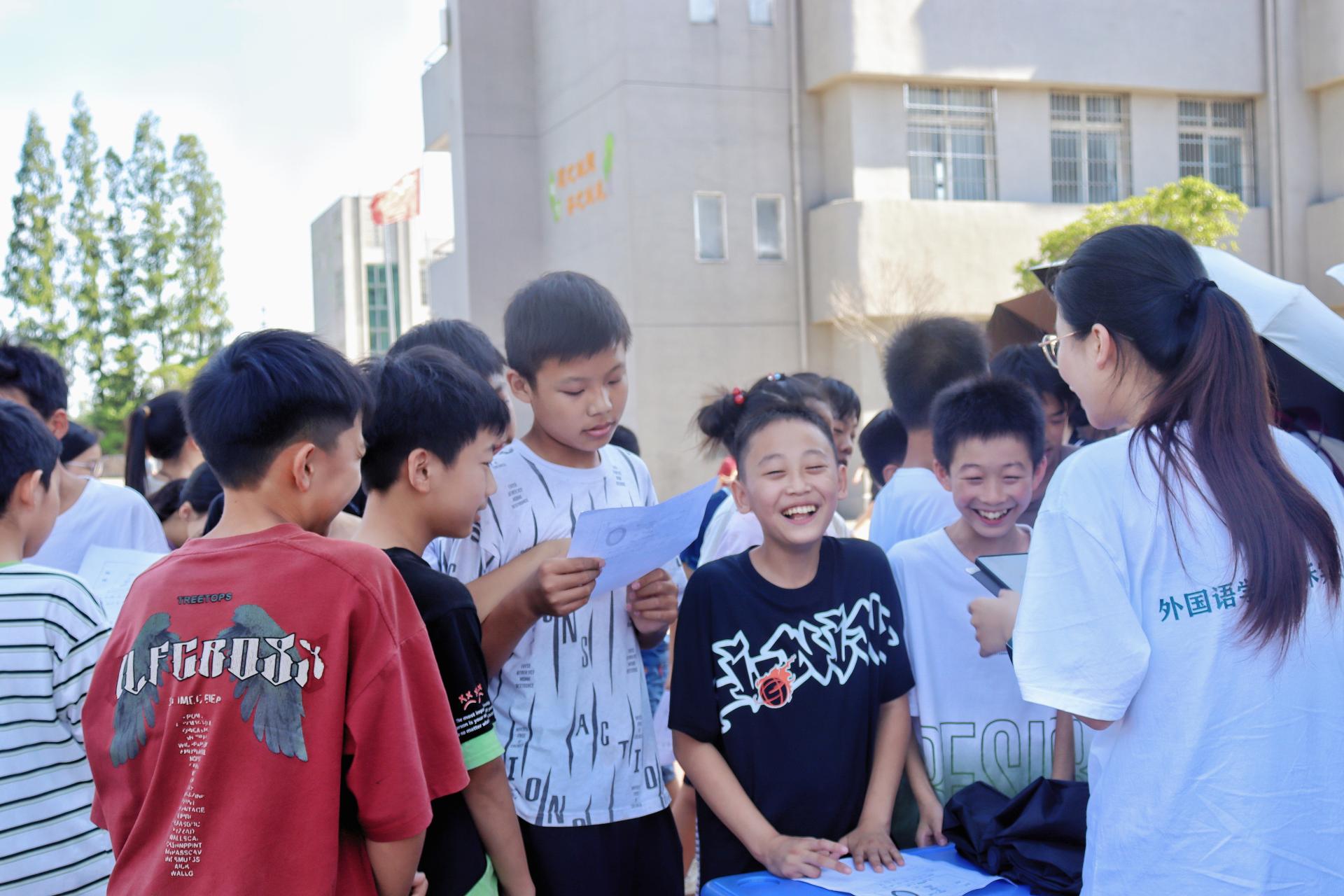 室内游戏紧张开展的同时,室外越野游戏也在有条不紊的进行。“学科知识竞赛”环节旨在巩固与拓展学生的学科知识与生活常识。同学们在趣味竞赛中既巩固了书本知识,又将知识拓展到课外,生动诠释了“课堂无处不在’的教育理念。操场另一边的“定向投篮”游戏中,小组成员们在实践队成员引导下,将篮球投入篮筐,完成一次又一次的得分。篮球与篮筐的碰撞声和孩子们的笑声交织在一起,气氛欢快。