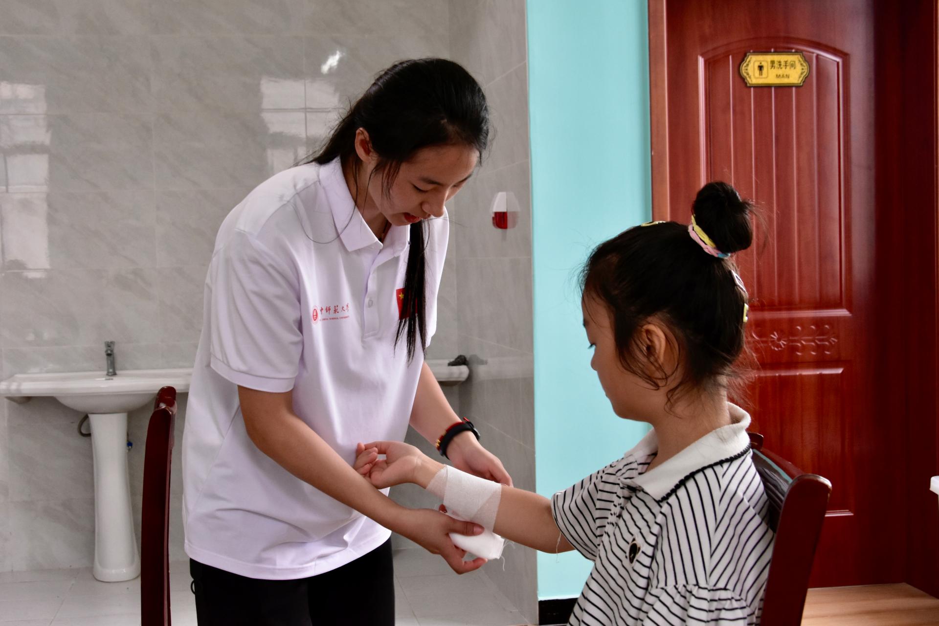在体育与健康课程教学中,即使缺乏适宜的场地,实践队队员依然认真地为孩子们示范每一个动作,悉心地纠正每一处错误。实践队带来的不只是体育的技巧,更有团结、坚持和拼搏的精神。通过组织团队比赛,孩子们学会团队协作。开展健身啦啦操训练,锤炼孩子们的协调性与灵敏性。课后的拉伸环节,培养学生良好的运动习惯。