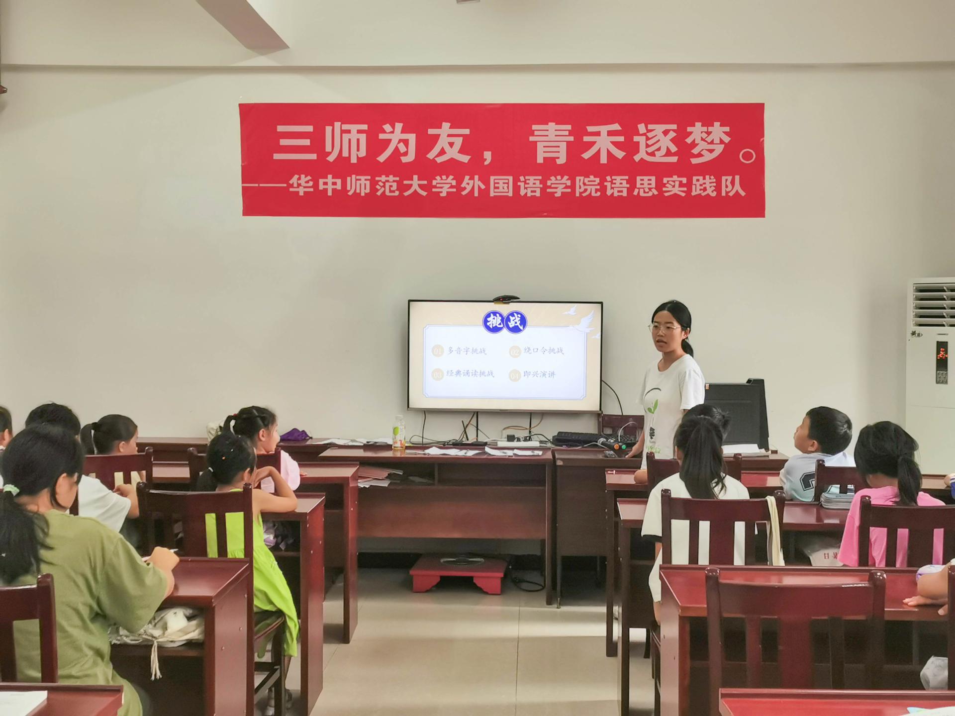 讲普通话,写规范字,做文明人。本次推普课程内容涵盖文字的发展演变历程讲解、普通话发音矫正以及朗诵技巧传授。杨文欣因地制宜,结合湖北地区不区分鼻音边音和前后鼻音的方言特点进行讲解,激发同学们的学习热情;王舒慧结合数字平台,运用中国语言文学数字博物馆、普通话小镇等软件,带领同学们诵读经典诗词,在推普行动中弘扬中华优秀传统文化。