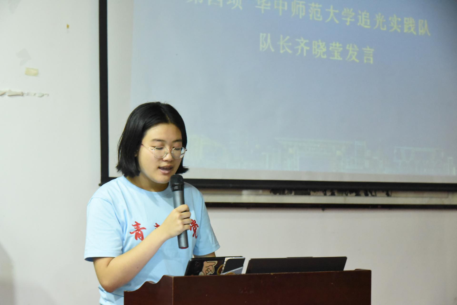 华中师范大学追光实践队队长齐晓莹代表全体志愿者进行发言。她首先向与会领导汇报了此次“希望家园”活动的具体开展计划与安排,同时代表全体队员表达了完成此次活动的信心和决心。齐晓莹表示,此次支教活动不仅仅是教育公益,对志愿者来说更是一种心灵成长,志愿者们的沟通能力和心理承受能力也在支教生活中得到锻炼。