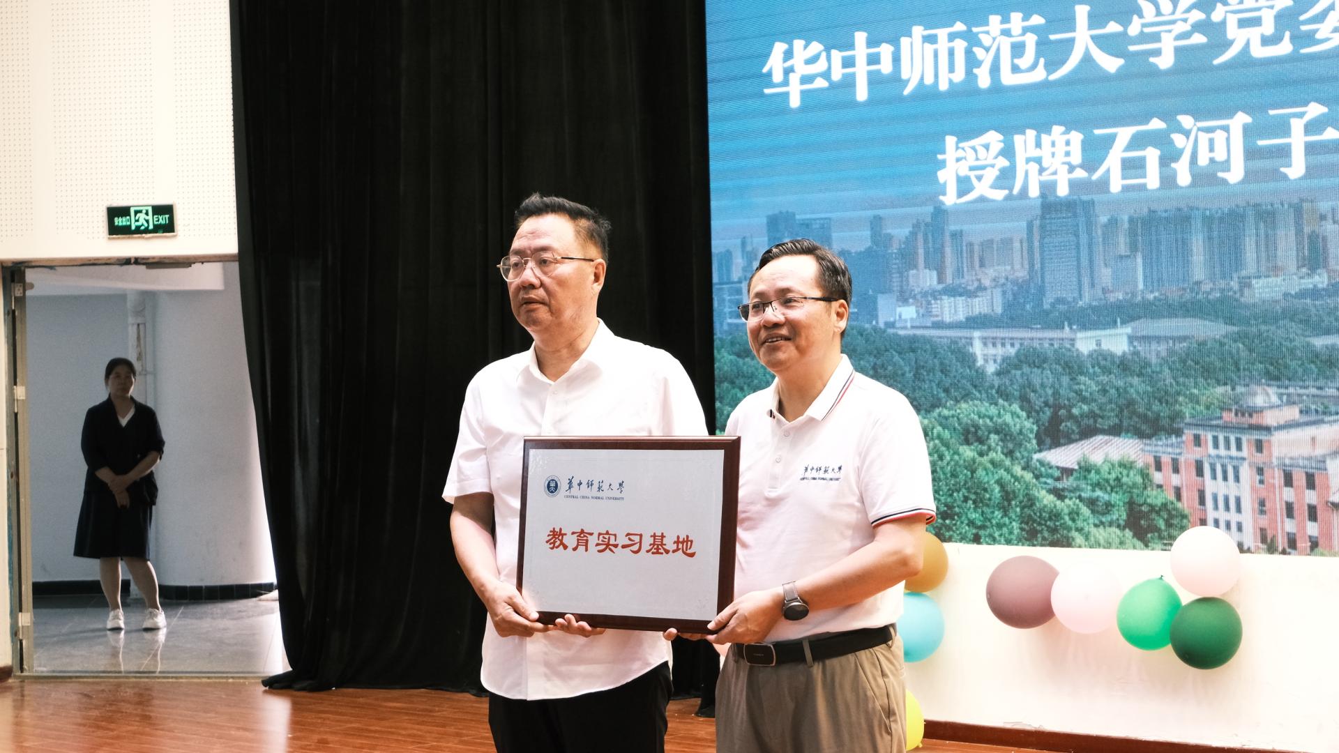 汇报演出结束,华中师范大学党委学生工作部副部长杨军授牌石河子第一中学教育实习基地,开启两校携手共进、共创辉煌的新阶段,表达了两校行稳致远、合作交流的共同期待。