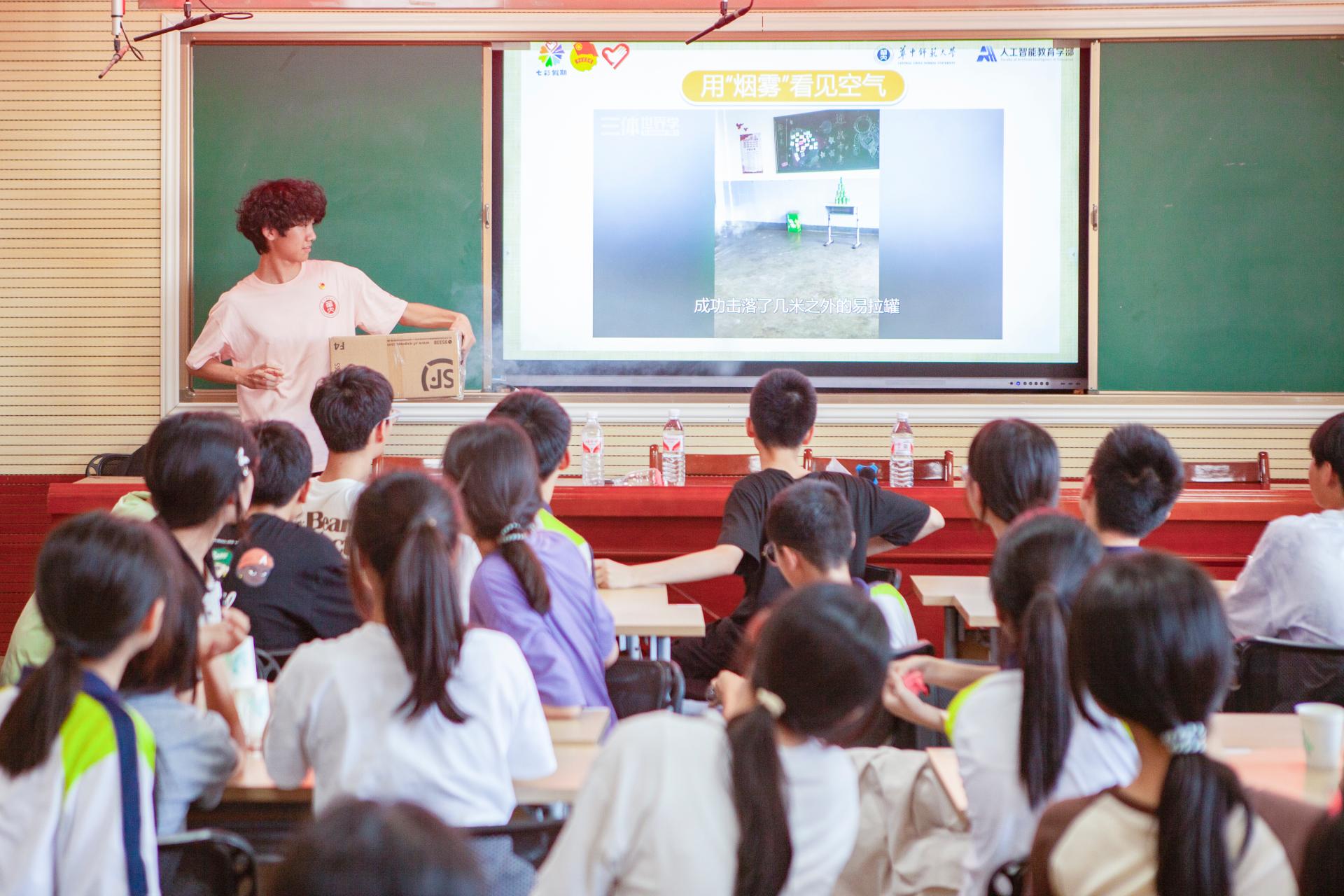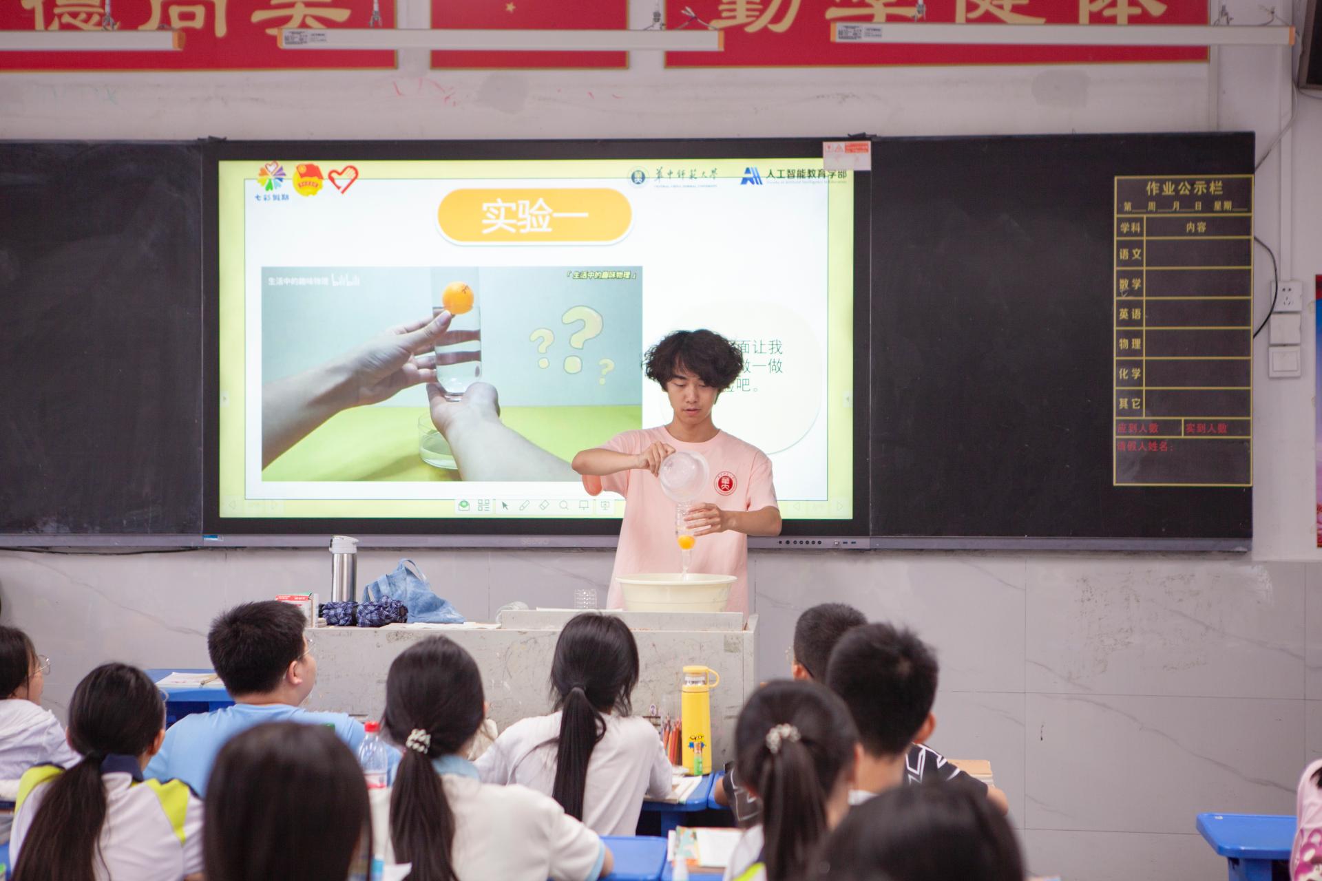 华大青年讯(通讯员 郭星怡 罗亚欣 余泽贤)科学技术是人类社会发展与进步的动力,科学教育是提高学生综合素质的重要途径。7月1日至13日,华中师范大学人工智能教育学部“智远同心”实践队赤壁分队(以下简称“赤壁队”)在赤壁市官塘驿中学开展以“智教结合·科学赋能”为主题的“科学进校园”活动。此次活动旨在通过智能教育与科学探究的深度融合,激发学生对科学的兴趣,提升他们的科学素养和创新能力。活动分为工程实验与教育、探究实验与教育、项目活动与实践三个板块,开展十六个课时,三百余名中学生参与,赤壁队队员余泽贤担任主讲人。