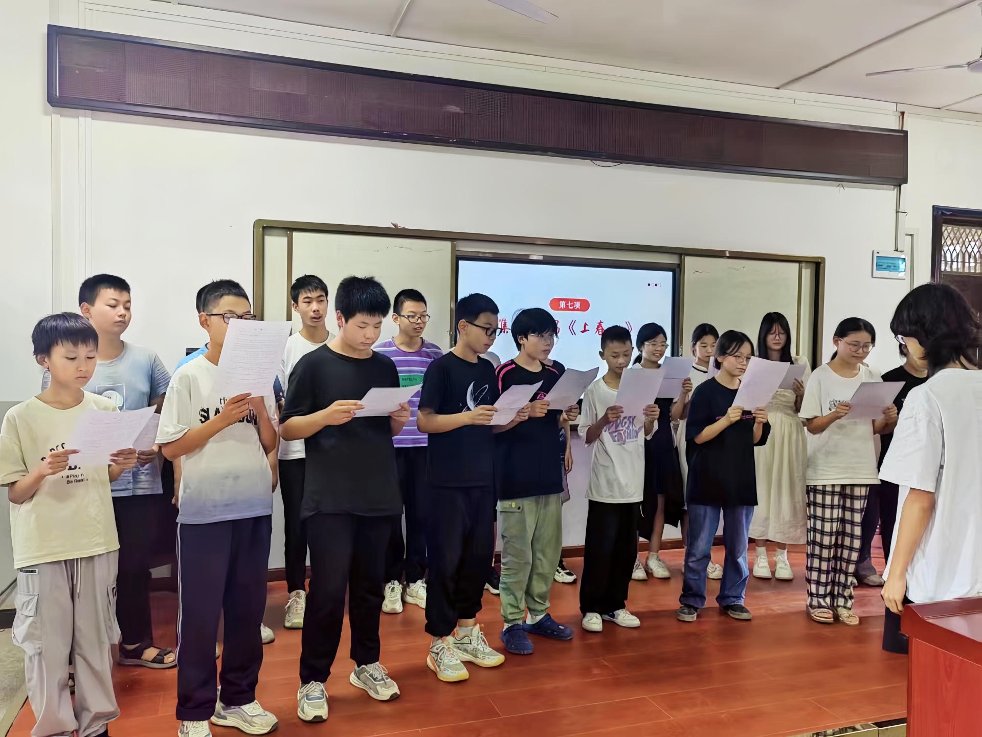 杨溪中学“七彩假期”夏令营学员通过进行现场合唱,展示近日剪纸、扎染、团扇及书法作品等多种形式,对夏令营成果进行展示。