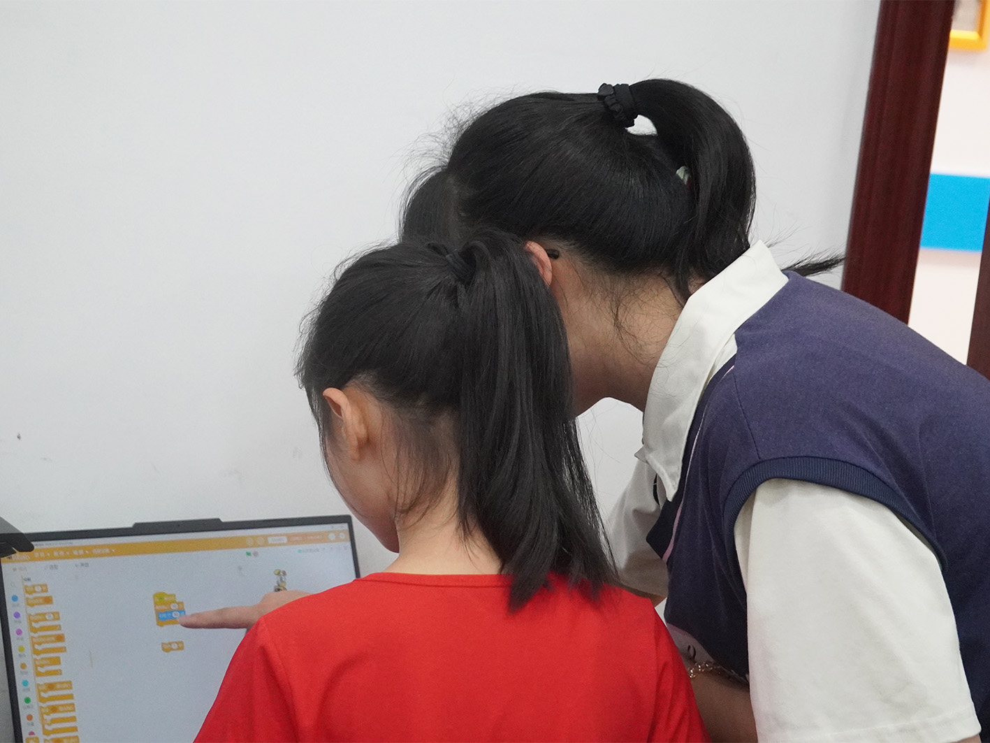 实践队队员引入“mind+”图形化编程软件,精心设计了一系列生动有趣的教学活动,用从简单到复杂的编程任务,来逐步引导学生探索和理解编程的基本原理和技巧。在课堂上,实践队员示范了如何利用图形化界面拖拽组件、设定指令,让学生们亲自动手完成编程任务。学生们通过尝试不同的逻辑和指令组合,激发出他们独立解决问题和创造新程序的能力。