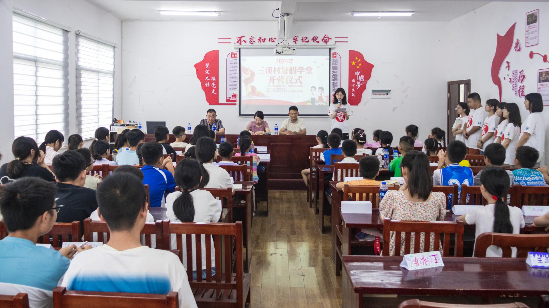 三溪村开营仪式由白霓队队员王恩桐主持。刘月琴发表致辞,感谢白霓队的无私奉献,希望学员们珍惜在暑期学堂学习的时间,度过一个充实而快乐的假期。饶冠军叮嘱学员们注意出行安全和防溺水安全。白霓队队长肖扬代表白霓队对崇阳县白霓镇人民政府、三溪村村委会表达谢意,希望学员们在此次活动中认识世界、家庭、与自我,正视学习、探索学习的乐趣,并由此树立新学期乃至更长远的目标。