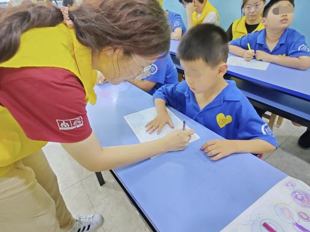 活动正式开始,志愿者孙淏喆给孩子们带来了趣味十足的绘画课——圆的故事,画出你心中的“圆”。首先,她在PPT上展示了生活中的圆,紧接着让他们创作自己心中的的圆,在志愿者的帮助下,孩子们都交上了自己的作品。随后,老师让孩子们发挥自己的想象将多个圆形图案融合为一幅作品,孩子们马上投入到创作中。在心理学中,绘画是一种有效的自我表达方式,能够帮助孤独症儿童更好地了解自己的情感和想法,同时激发他们的创造力。