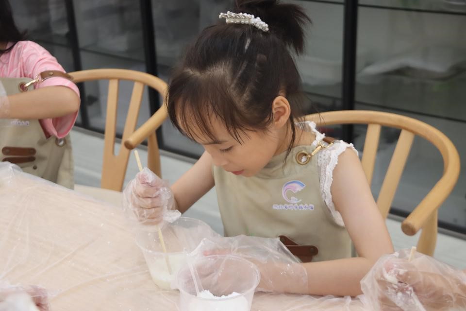 课程如火如荼地进行着。同学们开始自主动手制作玉米淀粉非牛顿流体——先倒入三比例的玉米淀粉,再慢慢加入一比例的水。在老师的仔细指导和同学们的细心操作下,同学们们都成功地收获了一份标准的非牛顿流体。接着,学生们利用自己制作的非牛顿流体体验这种神奇流体的特性。不少同学发现,当他们用搅拌棒轻轻触碰混合物时,混合物像液体一样柔软;但当他们用力捶打时,发现它像固体一样坚硬。这种奇特的现象让学生们惊叹不已,纷纷表示对科学的奥秘产生了浓厚的兴趣。
