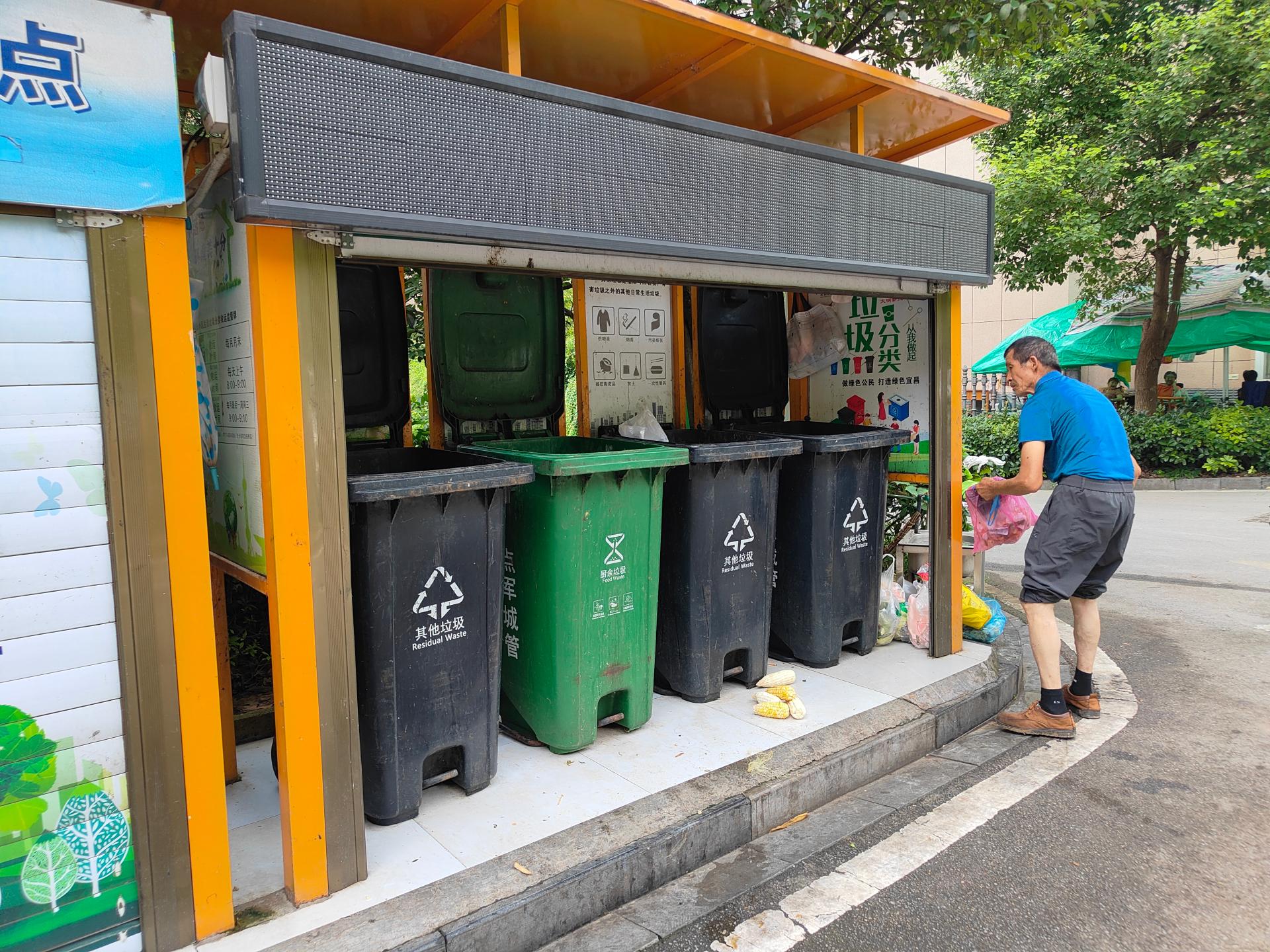 “垃圾分类就是新时尚”“垃圾不落地,环境美十分”“爱护环境,从我做起”……在五龙社区各个小区的宣传栏上,布满了这样的标语。在小区内的生活垃圾分类定时定点投放点,放置着黑、绿、蓝、红四种颜色的垃圾桶,分别对应其他垃圾、厨余垃圾、可回收物、有害垃圾。各小区均设有分类垃圾桶,方便居民投放。从居民那里,队员们了解到,社区十分重视垃圾分类的宣传教育,居民们也因此逐渐形成了垃圾分类的意识,越来越多的居民在家中提前将垃圾分好类再投放到对应的垃圾桶中。对此,社区的一位环卫工人表示,社区的宣传确实很充分,但居民的整体素质仍有待提升,大约40%的居民不做垃圾分类,甚至从远处投掷垃圾,“对于没有分类的垃圾,我们需要自己打开垃圾袋,一点一点地分好类。”