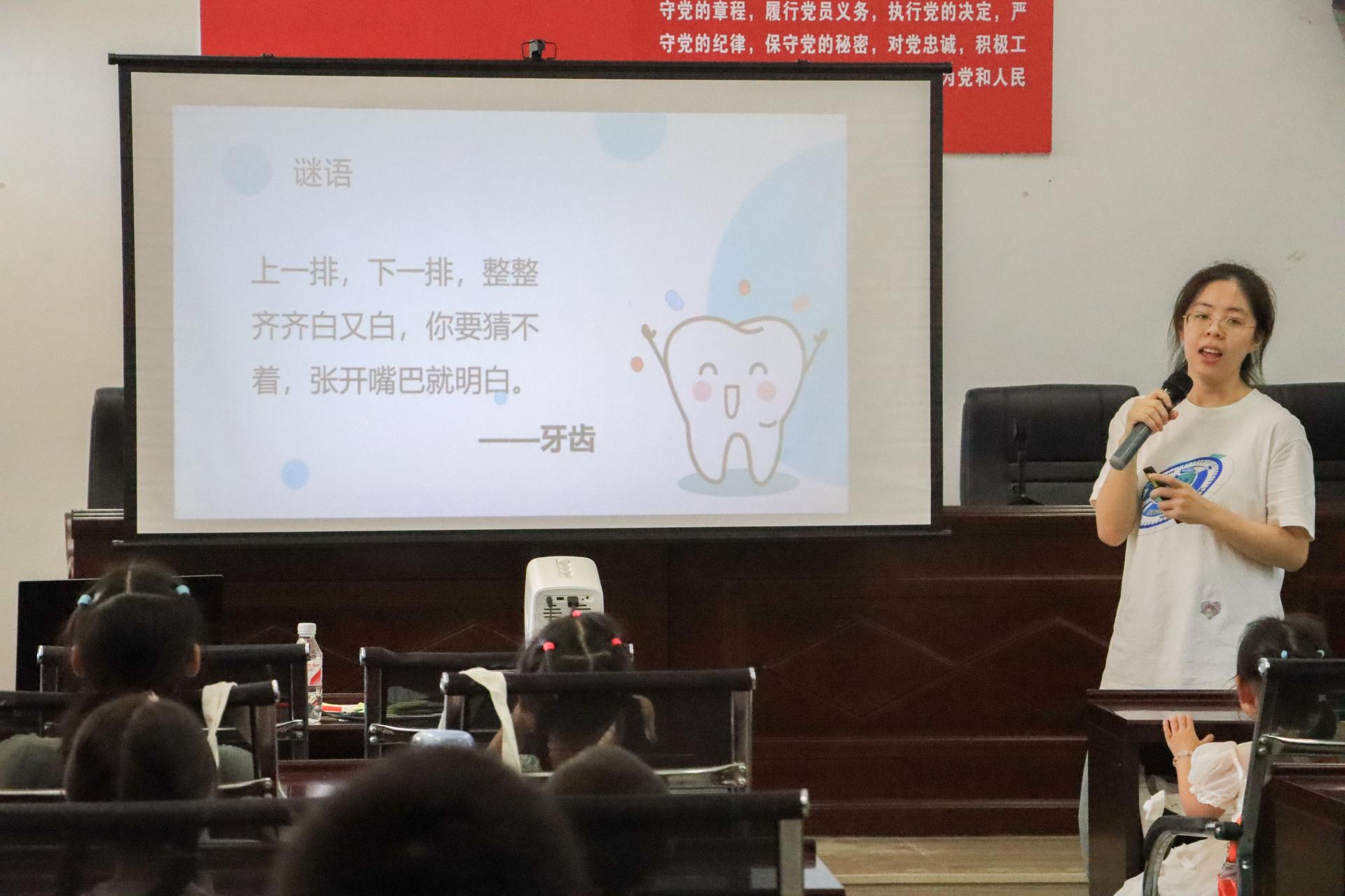 实践队队员吴晨瑜通过一条谜语“上一排,下一排,整整齐齐白又白,你要猜不着,张开嘴巴就明白”引入爱牙课堂。生活中许多行为,如爱吃甜食、不刷牙等都可能伤害到我们的牙齿。孩子们一起观看了蛀牙危害的教学视频,深入地了解了蛀虫对牙齿的侵害。在欢快的“宝宝巴士刷牙歌”中,吴晨瑜给孩子们详细讲解了刷牙的技巧,并为他们科普了儿童与成人刷牙用具和方式等的不同。爱牙护牙习惯的养成,不仅需要学校的卫生教育普及,也需要家庭良好氛围的推动。
