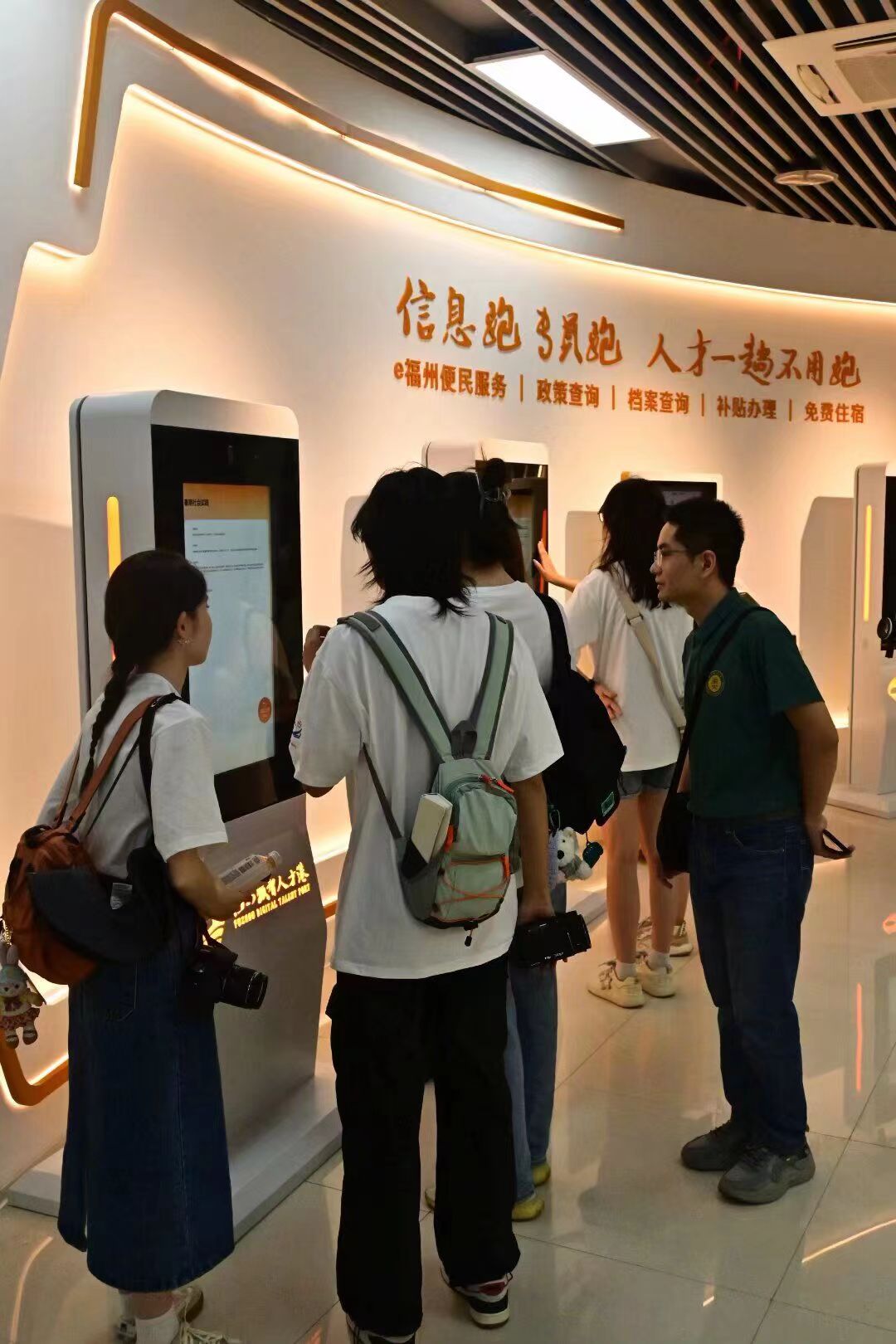 闽风福韵实践队参加福州市团市委联合市人才发展集团举办的2024年“好年华 聚福州”研学“来榕第一站”参观座谈活动。实践团成员跟随讲解员参观了福州数智人才港,了解全市唯一智能化、一站式“好年华 聚福州”智慧招聘平台,并实地体验“信息跑 专员跑 人才一趟不用跑”的数字化便民服务设施。