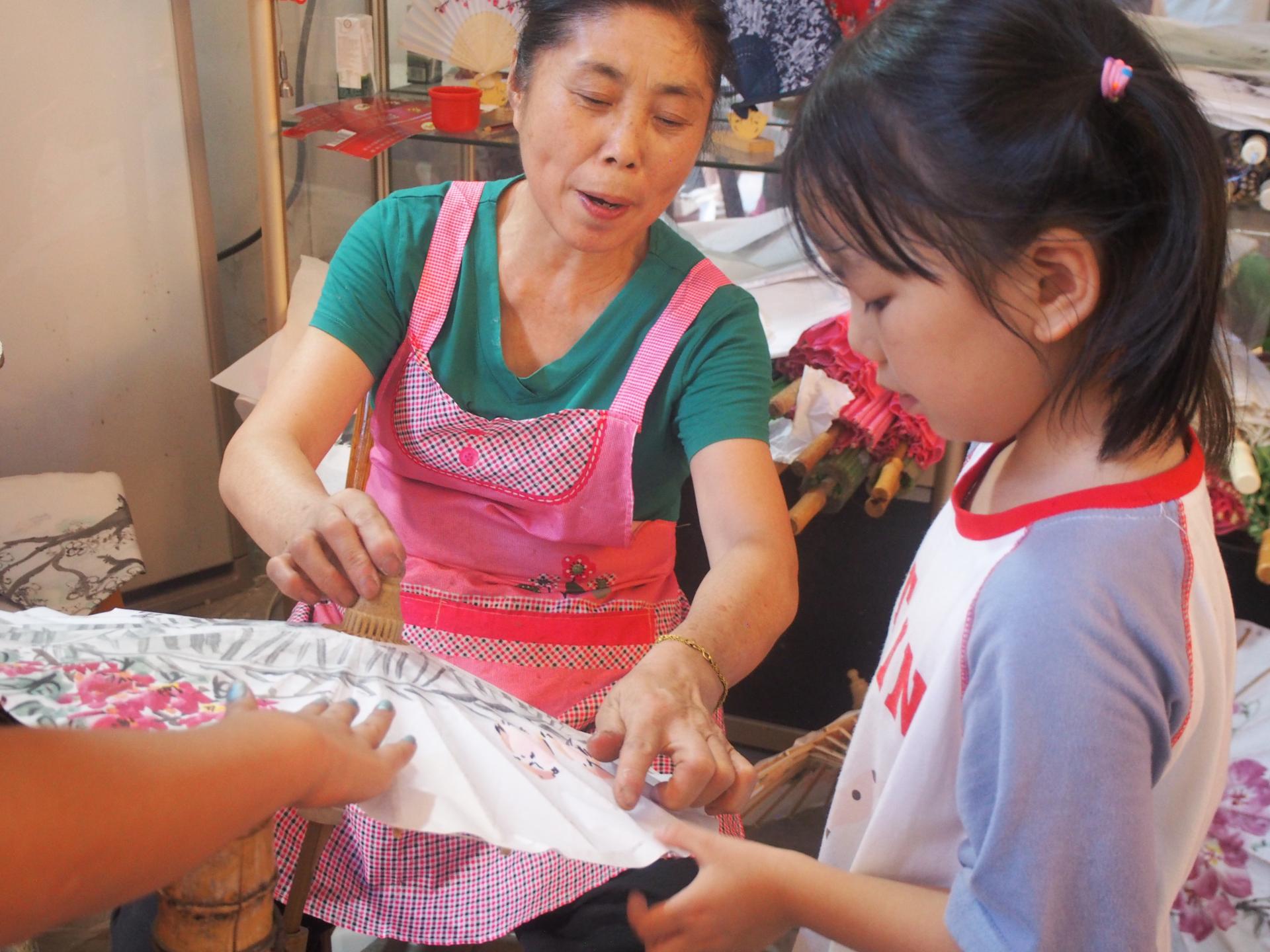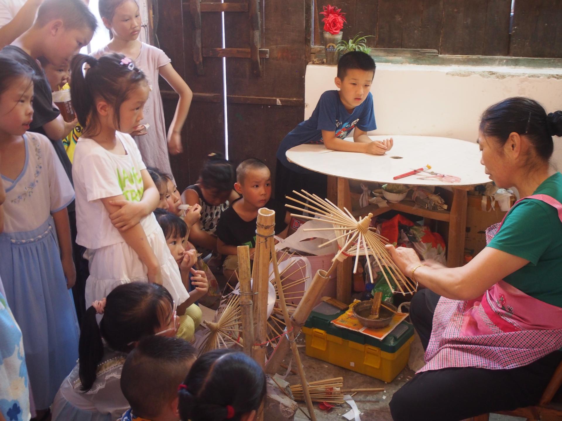 随后师傅还重复演示了制作过程来加深同学们的记忆。在组装伞面与伞骨的部分,有的小朋友在师傅的指导下能用恰到好处的力度将伞面与伞骨尽量贴合。师傅还向孩子们介绍了伞面有传统工艺也有机械工艺,油纸伞成品根据大小、伞面材质、绘画图案等的不同而具有相应的作用。活动的最后,所有孩子和师傅合影留念。