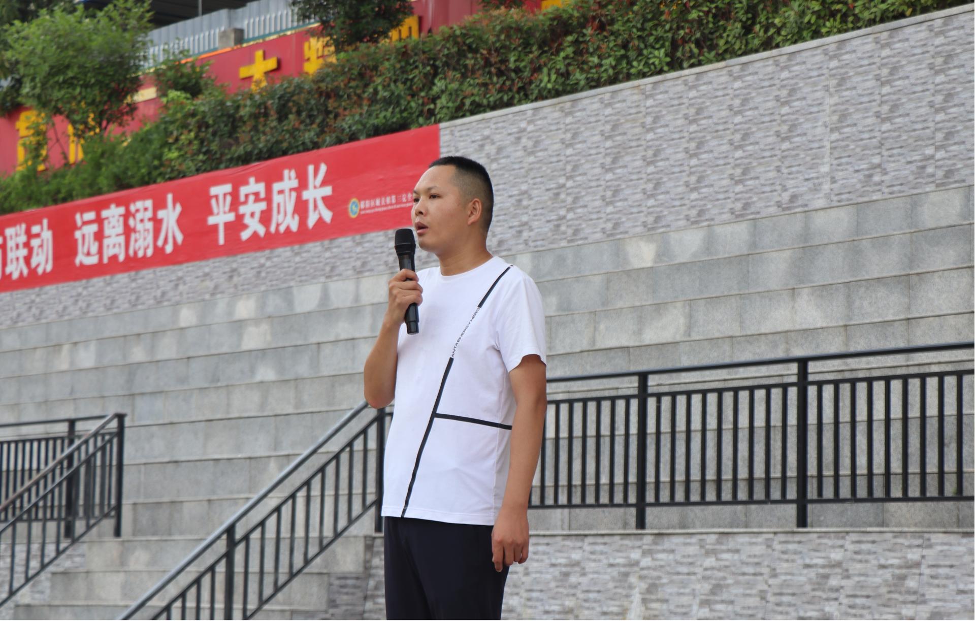 点名整队结束后,程士刚首先上台致辞。他向夏令营全体学生简要介绍了郧阳队队员,并对他们到来表示热烈的欢迎和衷心的感谢。他强调,在为期十一天的夏令营活动中,全体师生需高度重视纪律与安全问题,严格遵守作息时间安排和请假制度,确保活动有序进行。特别是在当前洪水高发期,他着重提醒学生注意自身安全,禁止前往水边嬉戏,同时要求老师们加强防溺水教育,确保每位学生的安全。