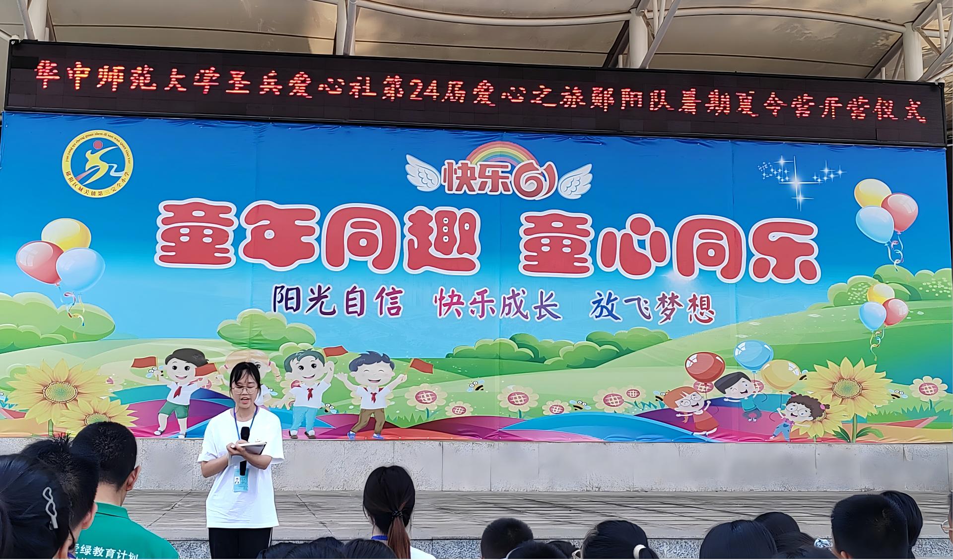 随后郧阳队队员代表陈淑琪上台发言。她表示,作为爱心之旅暑期社会实践队中的一员,她怀着感恩又激动的心情站上讲台;作为三尺讲台上的一名老师,她和郧阳队全体成员必将不负同学殷切期盼的目光,和学生一起在知识的海洋中遨游。发言最后,陈淑琪代表全体队员表达了对城关三小的感谢并预祝本次活动取得圆满成功。