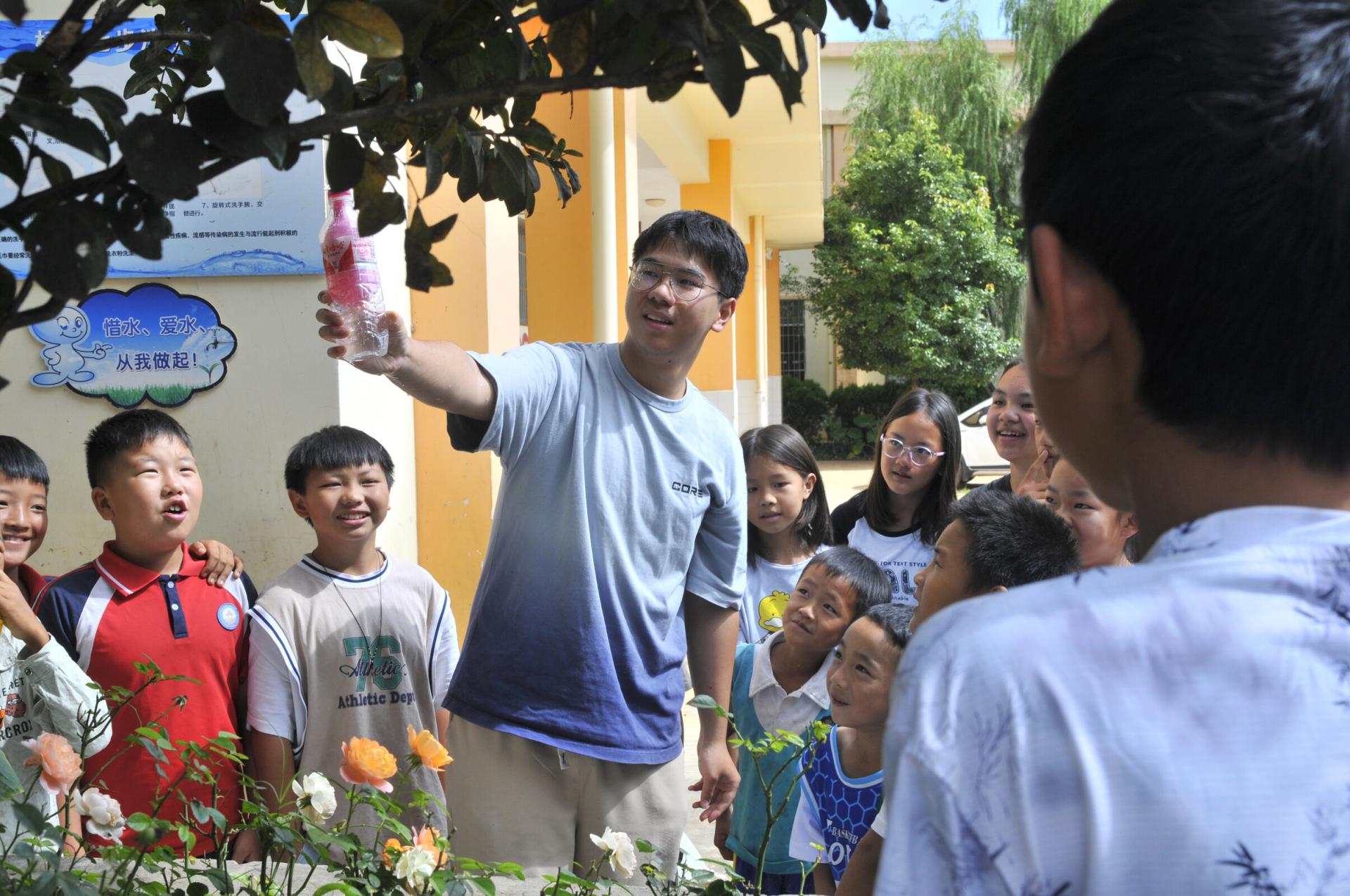 此外,队员张冬岩将与大气压力有关的实验带到了拖支白小学。在《看不见的力量——大气压力》一课中,张冬岩与同学们交流科学现象,组织同学们进行科学实验,引入空气中存在力的事实,并利用纸能撑住倒立着的水瓶这一例子,带领同学们认识大气压力。在张冬岩的引导下,同学们做了一些简易而贴近生活实际的小实验,如在户外利用大气压力自制“喷泉”等,切实感受到了科学的魅力。