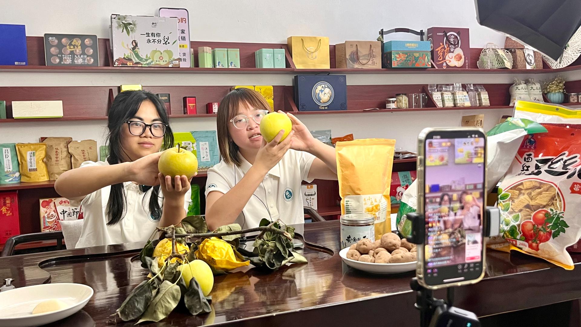 采摘与直播活动结束后,队员们满载黄金梨而归,随即投入到正式销售黄金梨直播的规划与筹备工作中。经过商讨,他们决定对以往的直播模式进行创新和改进。在直播过程中,队员李湘颖和谢忻彤直入主题,详细介绍了黄金梨的特点并进行了销售推广。