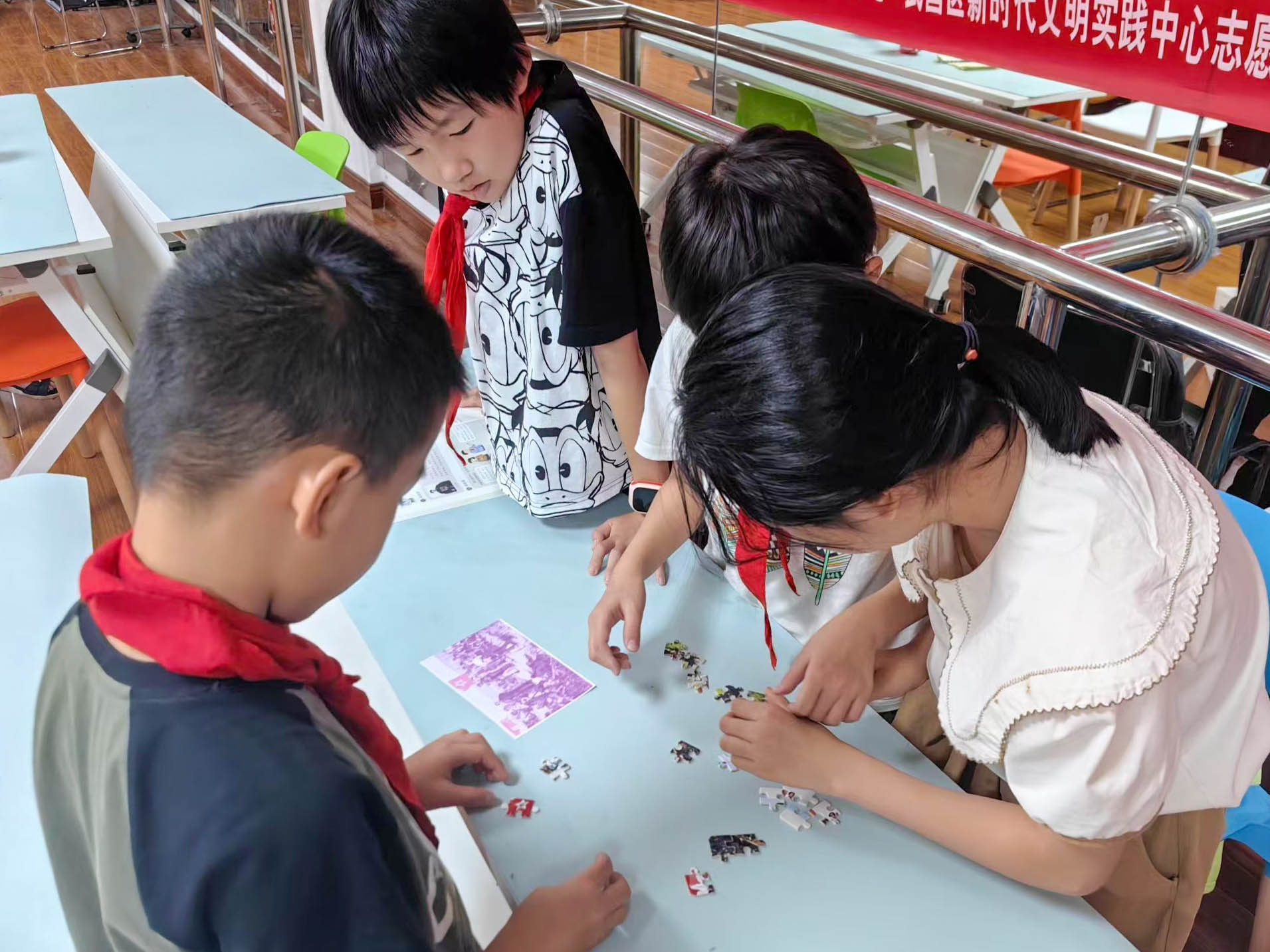 为增强活动的趣味性和参与性,实践团成员还设计了一系列寓教于乐的互动体验活动。“红色拼图”游戏让孩子们在动手操作中探索了开国大典、秋收起义、南昌起义等历史事件,“红色飞行棋”则让他们在游戏中了解了革命先烈的英勇事迹与智慧。在绘制书签环节,实践团成员鼓励孩子们发挥想象力,将自己心中的红色故事绘制成精美的书签。这些活动不仅让孩子们学习到红色文化知识,更有助于提高他们的创造力和表达能力。