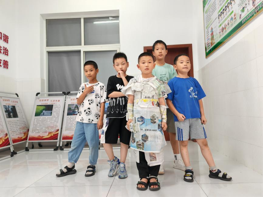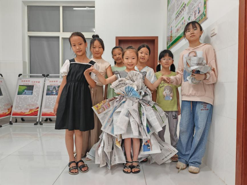 在志愿者老师的指导下,同学们在课堂上以小组为单位,认真思考、积极实践。巧妙地将报纸折叠、剪裁、粘贴,制作出各式各样的帽子、裙子、披肩和配饰,他们把平日里被忽视的废旧报纸转化为一件件独具匠心的服装。每一件作品展现了同学们的无限创意,更传递了环保的理念,让观赏者深刻感受到环保的魅力。