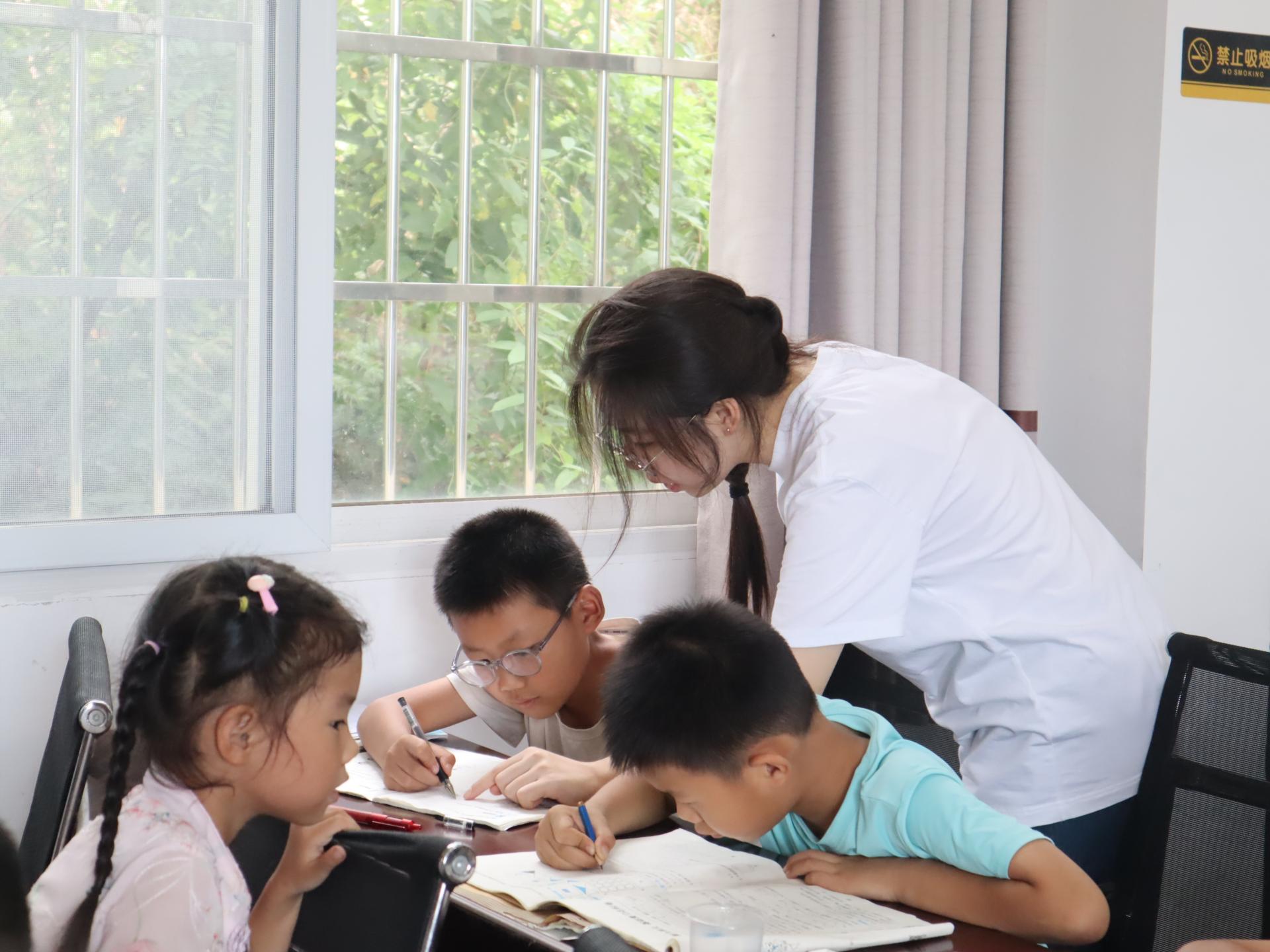(教学组吴晨瑜正在悉心教导孩子解决暑期作业上的问题)