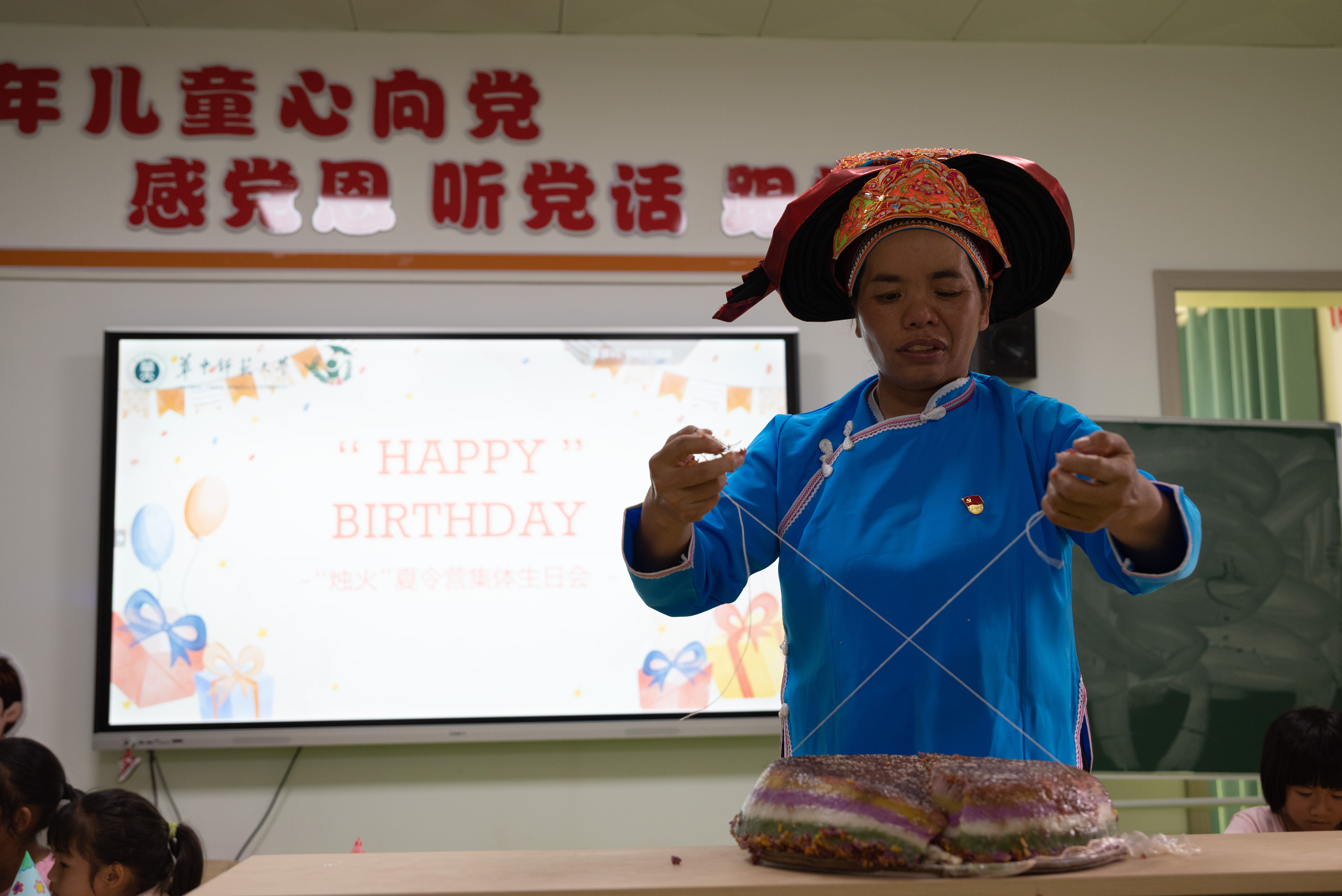 “祝你生日快乐……”在所有课程结束后,伴随着欢快的背景音乐,聆杉实践队为夏令营全体学生举办了集体生日会。经调查,大部分的学生都是留守儿童,没有过生日的经历。为了给孩子们带去惊喜与温暖,队员们乘坐班车前往乡镇购买文山特产蒸糕作为生日蛋糕,提前用卡纸制作生日帽并引导学生装饰自己的生日帽。生日会上,整个教室充满了欢声笑语,凹嘎村村民委员会妇女主任罗平艳为孩子们切蛋糕,孩子们将名字标签插上蒸糕,一起许下美好的生日愿望。