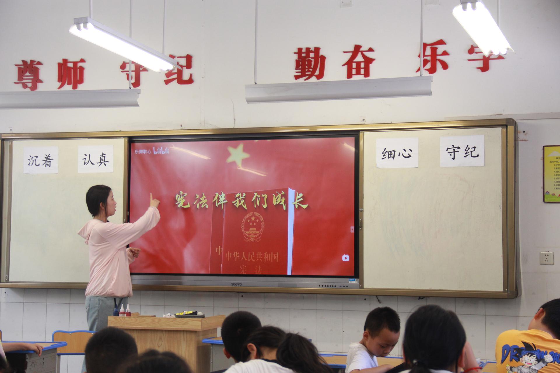 着眼于培养学生的宪法观念,实践团成员刘美容教唱歌曲《宪法伴我们成长》。“蓝天下 宪法为我们护航”,通过演唱歌曲、感受旋律,同学们深刻感悟宪法的庄严与神圣,充分体会到了宪法作为国家根本大法的重要性。