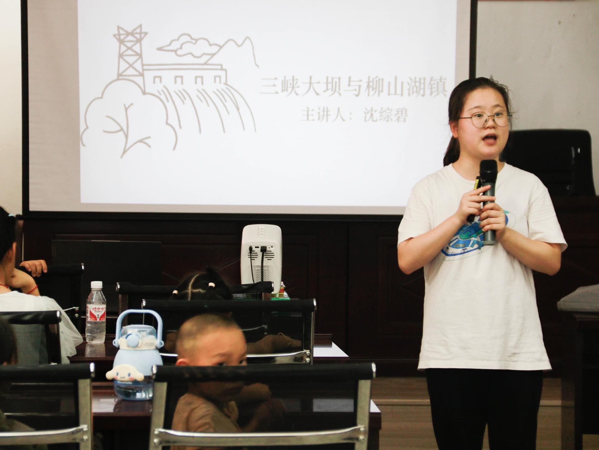 柳山湖镇是三峡大坝试验坝——陆水大坝的移民安置区,对三峡大坝的建成有着重要意义。随着时间的流逝,柳山湖镇的移民历史在年轻一代的心中逐渐淡去。因此,实践队队员沈综碧向同学们讲述了这段历史。她从三峡大坝建设的重大意义出发,详细描绘了柳山湖镇移民先辈们在一片荒芜中,用勤劳的双手和坚韧不拔的意志书写了一部部感人至深的奋斗史。