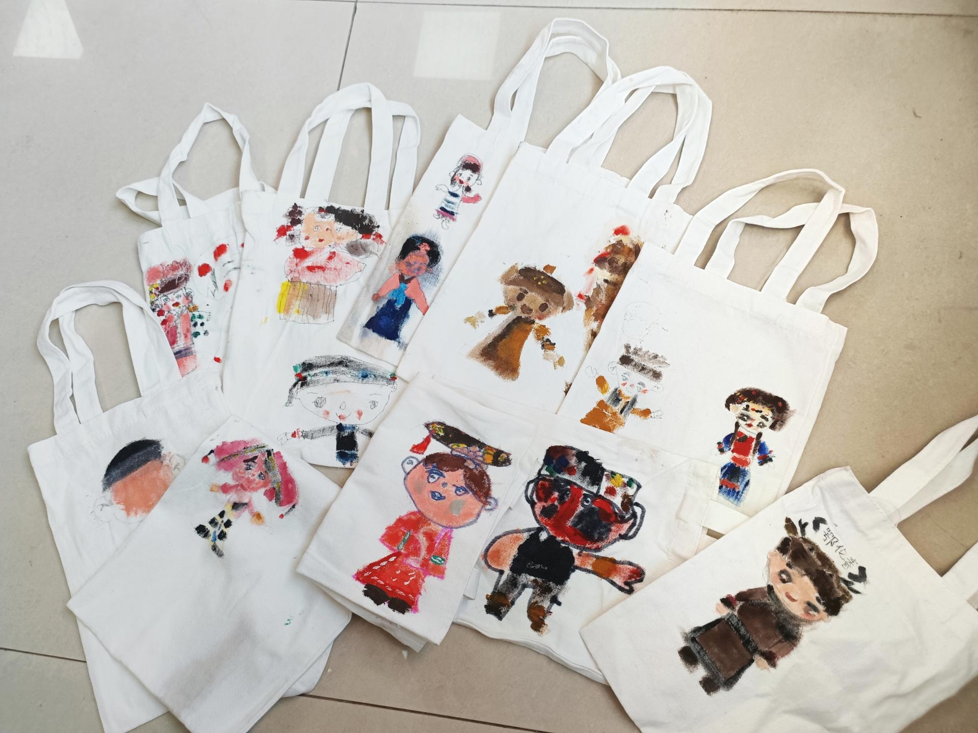 谢鑫瑶给学生们分发小布袋、颜料、画笔等材料,学生们每人选择一张喜爱的少数民族服饰卡片进行参照作画。谢鑫瑶步步引导,细心示范,学生们仔细观察卡片上民族服饰的特点,以笔勾勒,用心填色。白白的布袋和各色民族服饰,在学生们的画笔下碰撞出了最鲜艳的色彩。
