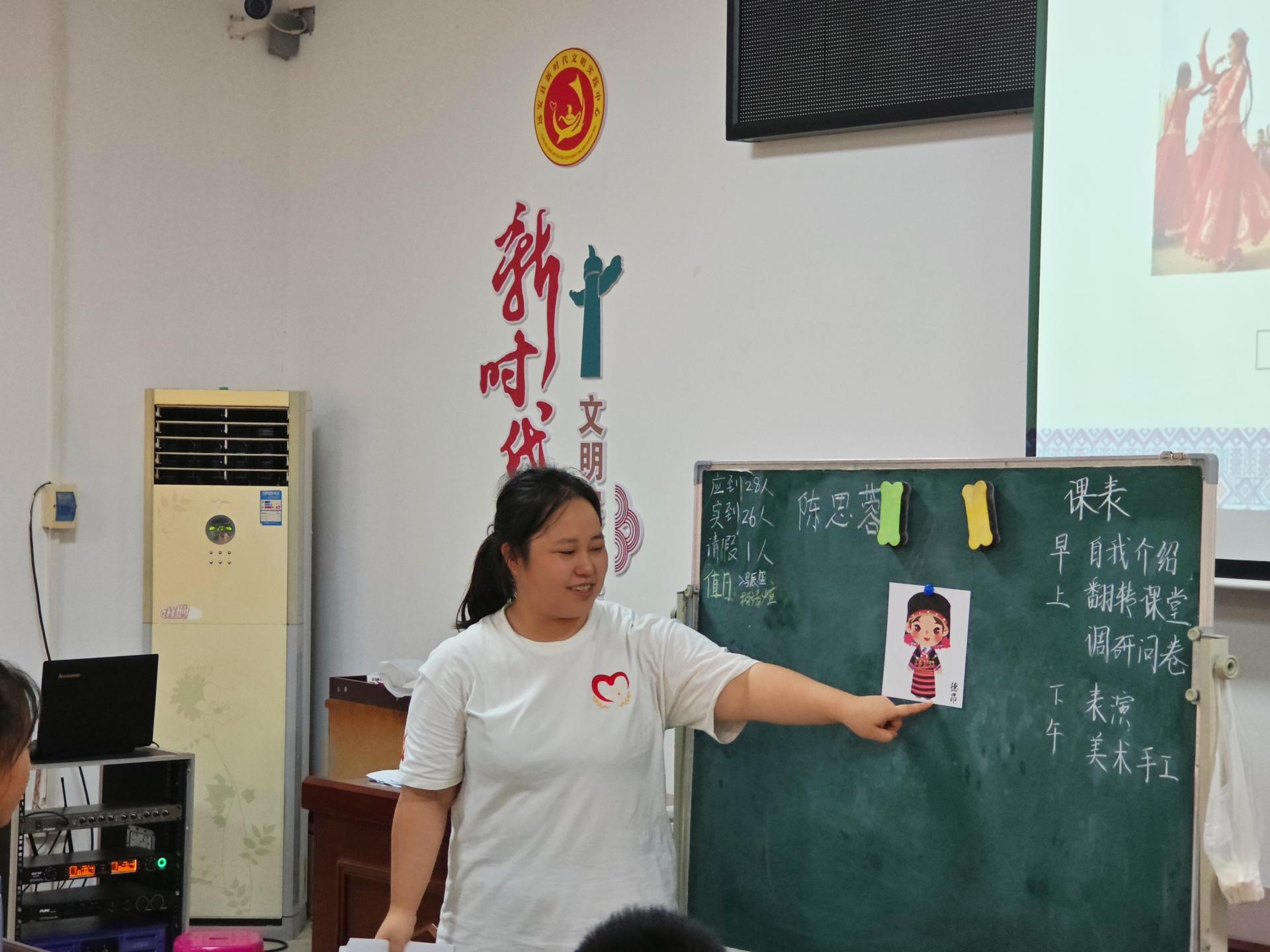 华大青年讯(通讯员 黄小润 刘启航 兰梦洁)为贯彻中华民族共同体意识,了解各民族的民族特色,7月31日上午,华中师范大学外国语学院心火支教团远安队(以下简称“远安队”)在宜昌市远安县茅坪场镇开展了以“绘出美丽中国”为主题的民族服饰美术活动。远安队队员谢鑫瑶担任主讲教师。
