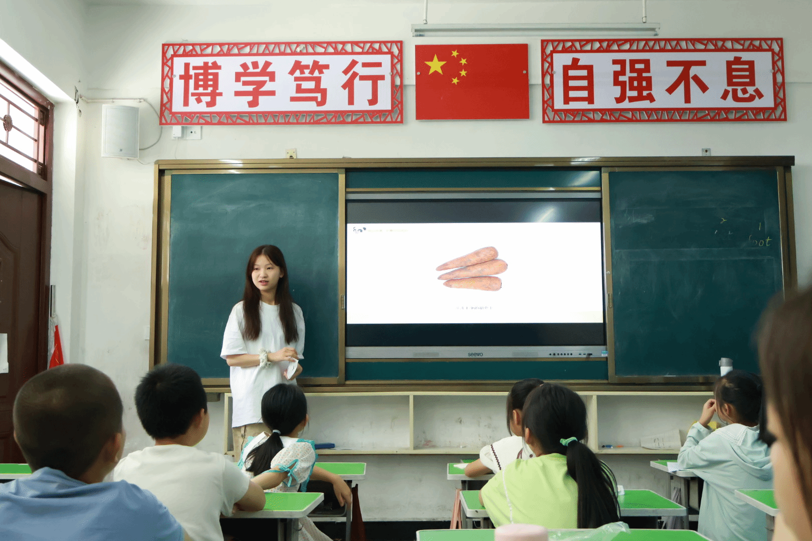 随后,包玉娇以图文并茂的方式,向孩子们展示了垃圾食品、三无食品以及过期食品的危害,引导他们学会辨别并远离这些不安全的食品。与此同时,她还介绍了十大健康食物,鼓励孩子们多吃这些营养富足且安全卫生的食品。在互动环节,孩子们踊跃地举手发言,表述着他们对食品安全的看法和理解,包玉娇给予了及时的反馈和指导,课堂氛围融洽。