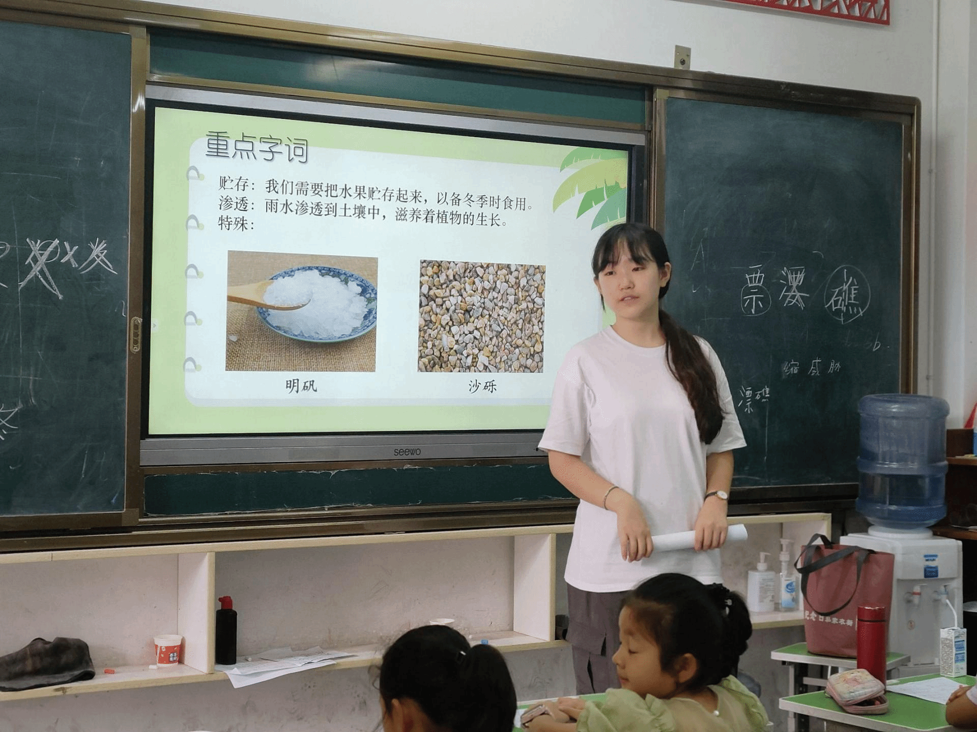 建始县地处大山深处,水资源富足。为契合支教地水资源充沛的自然条件,语文组成员们在备课时选择了《神奇校车之水的故事》绘本。该绘本以生动有趣的图画和通俗易懂的文字,带领读者跟随能自由变化形态的神奇校车成为一滴水,自天空落下,进入溪流和湖泊,流进水库,最终走进自来水厂,感受净水过程。整个课程详细地为低年段的同学们讲述了水循环和净水的有关知识,增强了学生对水资源的理解。