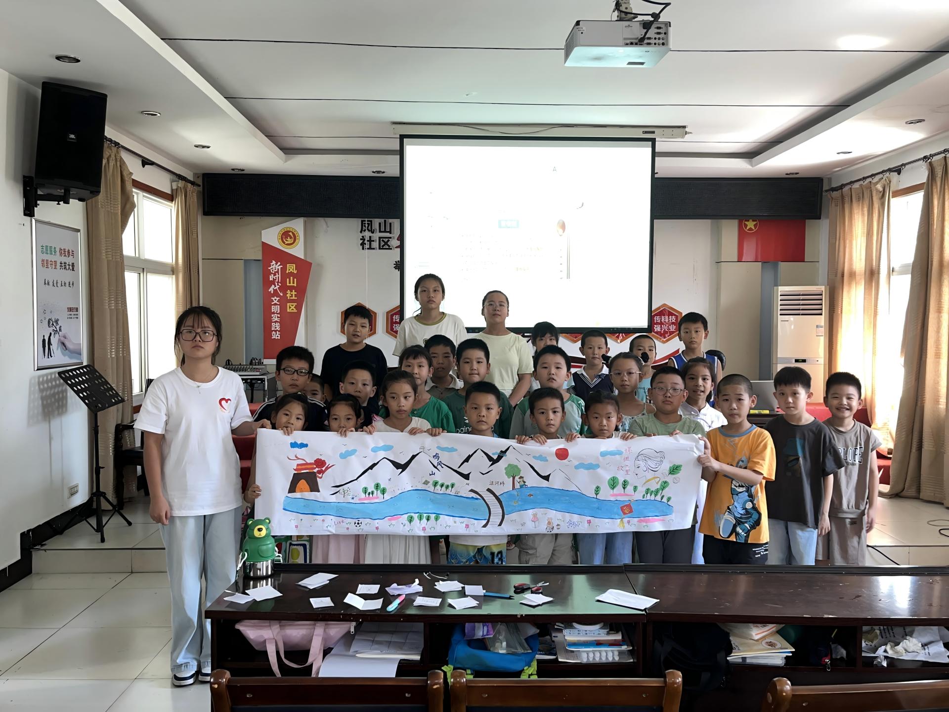 活动伊始,凤山社区的点位的学生们在老师的引导下,仔细描绘着鸣凤山的门楼、山峰、湿地公园、古桥、城墙以及嫘祖标志性建筑等元素。他们用画笔聚精会神地勾勒出每一个细节,一笔一划都流露出他们对家乡美景的热爱和骄傲。这2米的画幅,不仅表达了学生们对远安自然之美的赞颂,也凝聚着实践队对传统文化的探索之旅。