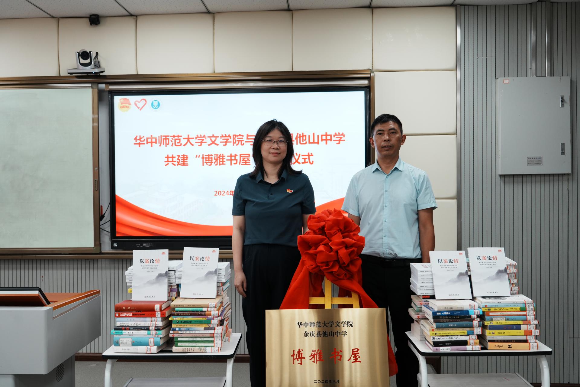在掌声中,杜娟向余庆县他山中学赠送了由她担任副主编的书籍《以案论情——核心素养导向的高中语文情境化教学实践与探索》,该书将为学校师生提供宝贵的教学参考。随后,杜娟与谭朝胜共同为“博雅书屋”揭牌。