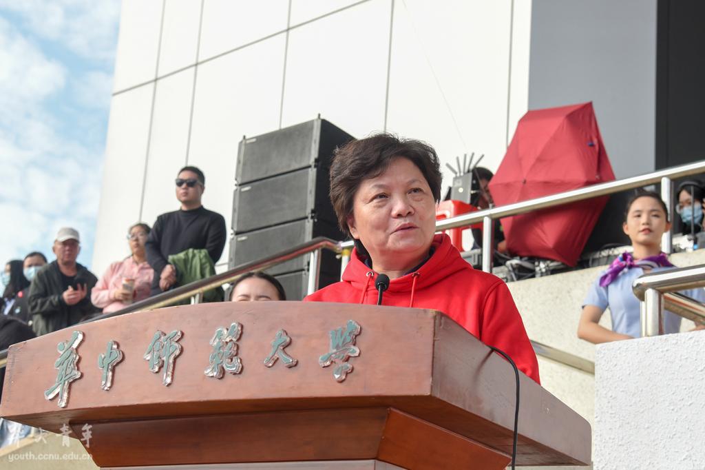 在全体起立,庄严的升旗仪式之后,郝芳华致开幕词,向所有来宾、领导、老师以及同学们表示热烈欢迎。她回忆疫情期间华师人用特有的方式向社会贡献华师力量,并强调体育是新时代竞技建设工程中至关重要的一环。郝芳华鼓励华师学子积极弘扬体育精神,感受体育运动的魅力。“尊重对手,尊重比赛,比出风格,比出水平。”最后郝芳华预祝本次运动会取得圆满成功。