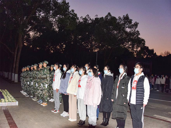 早上6时30分许,天蒙蒙亮,已有老师和同学来到文华公书林等待观看升国旗仪式。伴随着嘹亮的军歌声,国旗护卫队迈着整齐划一的步伐,英姿飒爽地沿桂中路进行分列式展示,随后进入文华公书林,护卫国旗走向升旗台。