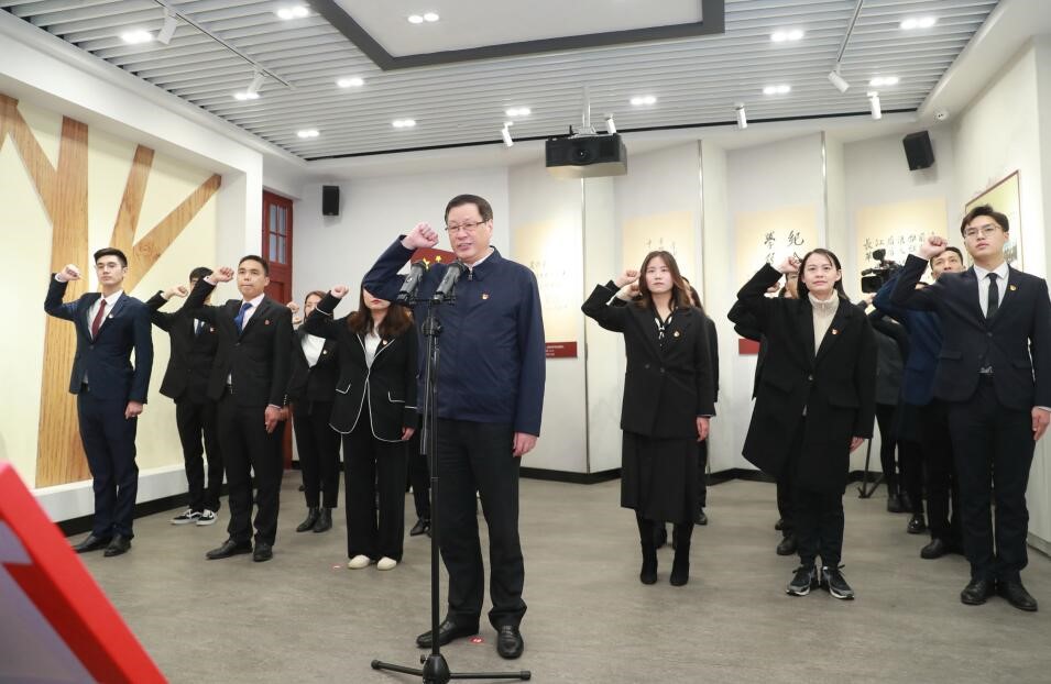 作为武汉中学前身的私立武汉中学校旧址纪念馆是见证共产党人初心起航的地方,3位中共一大代表董必武、陈潭秋、李汉俊曾在此任教,一大批革命志士曾在此求学。在武汉中学荣誉室,来自教育、卫生、社区等领域的新党员代表朝气蓬勃,应勇带领大家面向党旗宣誓。
