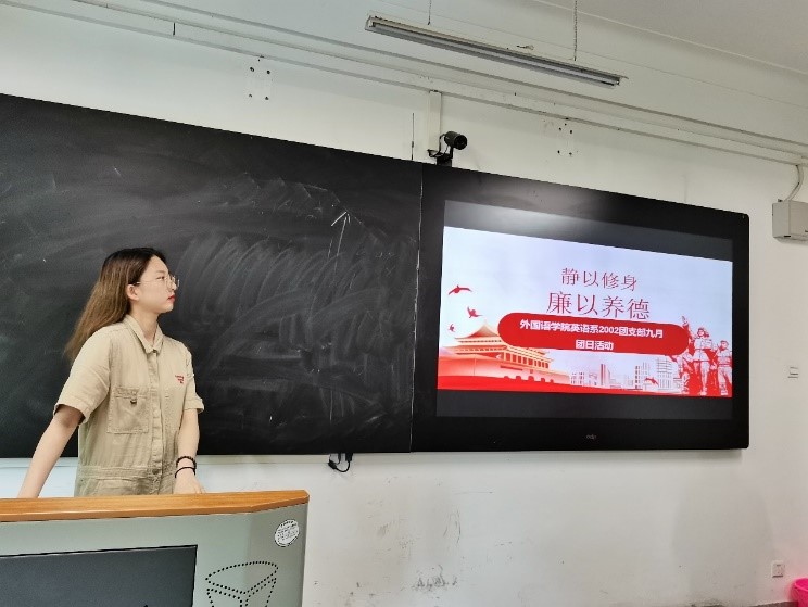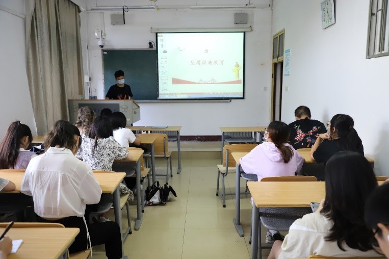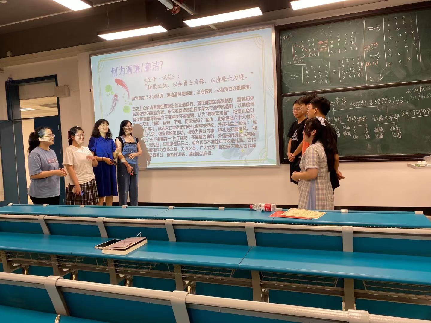团支部书记周硕通过学习十九届中央纪委五次全会精神、省委《清廉文化建设意见》精神和有关廉洁案例,引导同学们了解廉洁文化,牢记“公生廉、明生威”的时代教训,做遵规守纪的时代新青年。