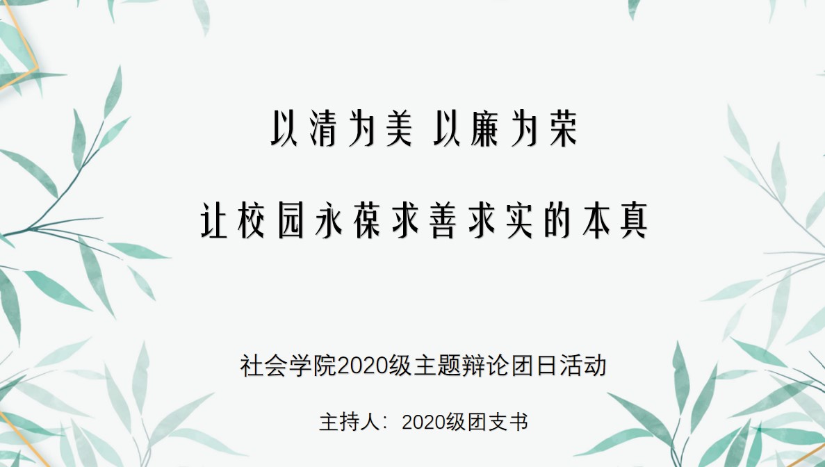 为积极助力廉洁文化进校园,社会学院2020级组织开展了“以清为美,以廉为荣”主题辩论活动,主要包括廉洁文化经典人物论述、清廉校园是什么样子等议题,鼓励同学们积极参与辩论中来,进行深刻认识廉洁文化对于青年成长的重要导向,使清廉理念入耳、入脑、入心、入行。