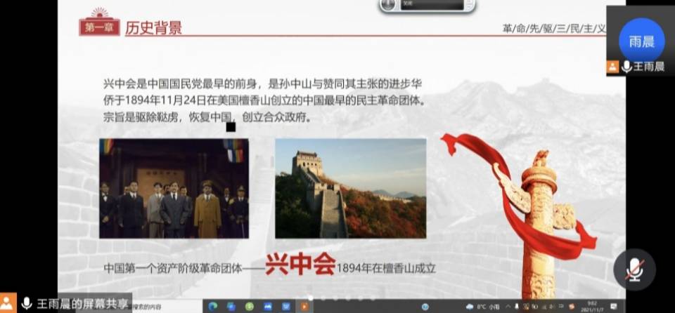11月7日,生命科学学院2106和2103团支部共同举办了此次主题团日活动。支部成员在团支书介绍辛亥革命的历史背景及主要历程后,集体进行了辛亥革命知识学习,并观看了电影《辛亥革命》的精彩片段。同时两支部围绕“辛亥革命是成功了还是失败了”这一问题展开激烈讨论,并积极开展了辛亥革命线上知识竞赛。