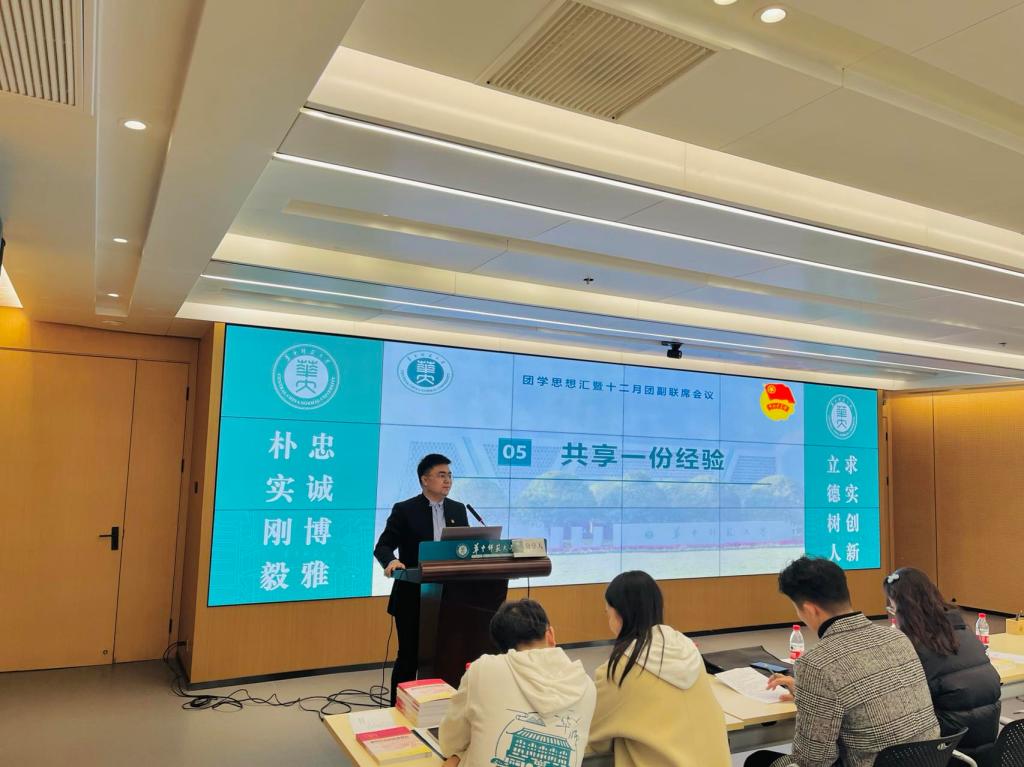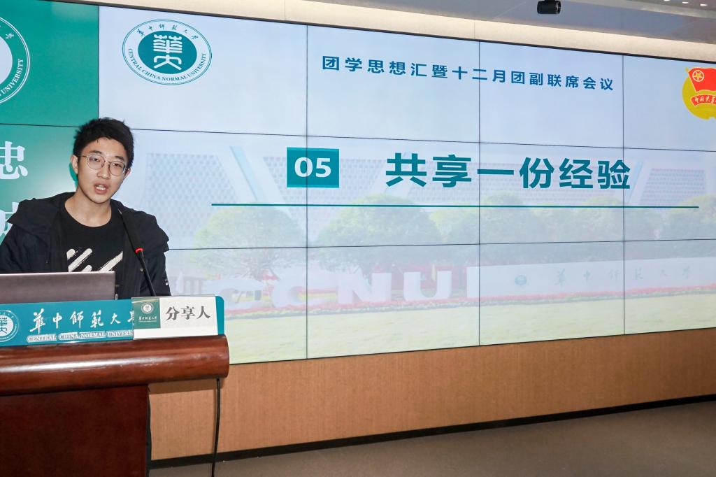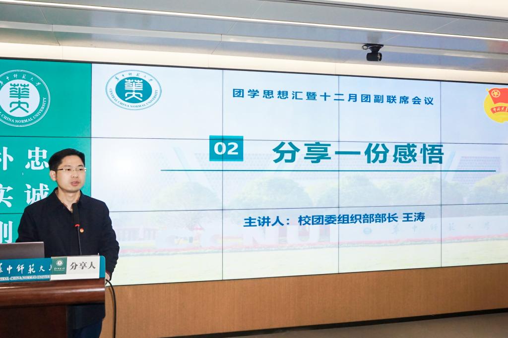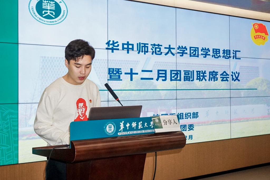 为进一步增强校级院级团学组织联动,扎实高效推进青年大学习、智慧团建等工作,12月12日上午,华中师范大学团学思想汇暨十二月团副联席会议在九号楼六楼融媒体中心会议室顺利举行。校团委组织部部长王涛老师、校团委副书记(学生)陈凌继霄、校团委组织部全体成员、恽代英菁英学校、各学院团学工作骨干参与本次活动。本次团学思想汇由校团委组织部主办,文学院团委承办,分为“共学一个主题、分享一份感悟、展现一院风采、研讨一个话题、共享一份经验”五个环节,校团委组织部李瑞浩主持活动。