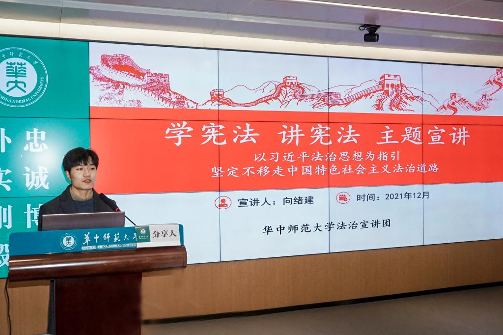 会议邀请到华中师范大学法治宣讲团以“学宪法、讲宪法”为题展开主题宣讲,在“共学一个主题”环节,为大家深入讲解了习近平法治思想的理论逻辑与核心要义,并结合我校宪法日系列活动,阐述了“宪法精神”的主要内容。